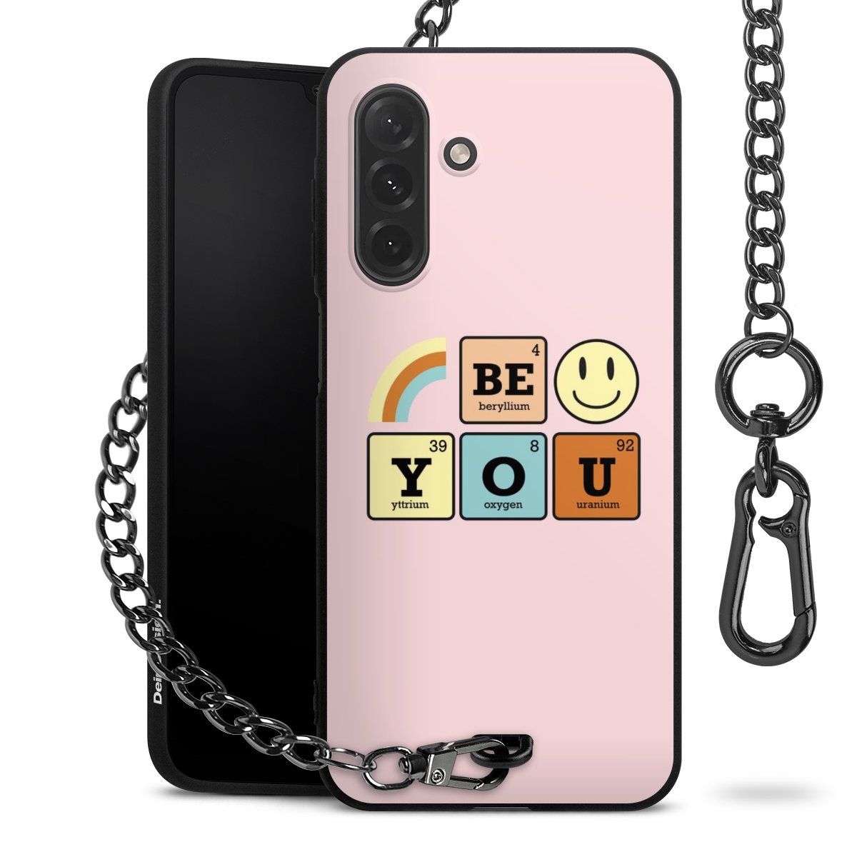 Die mattschwarze Silikon-Handyhülle besteht aus robustem TPU (thermoplastisches Polyurethan). Sie ist flexibel und schützt Dein Smartphone vor Stößen und Kratzern. Die Kette sowie der Karabinerhaken sind aus Metall in Gunmetal-Optik gefertigt. Für dieses Produkt kommen ausschließlich TÜV-geprüfte Materialien zum Einsatz.