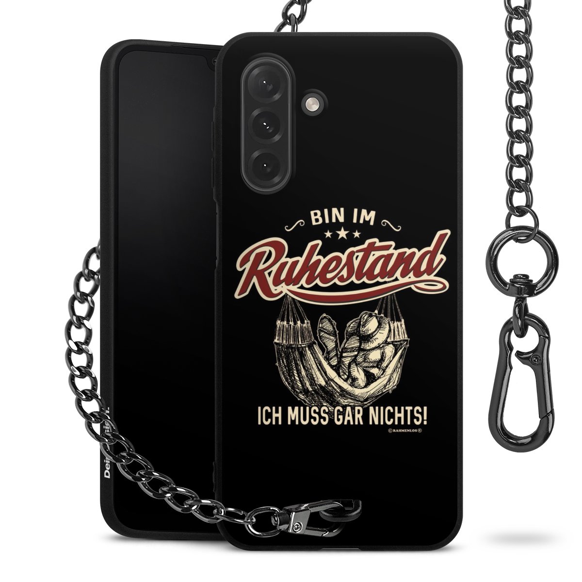 Die mattschwarze Silikon-Handyhülle besteht aus robustem TPU (thermoplastisches Polyurethan). Sie ist flexibel und schützt Dein Smartphone vor Stößen und Kratzern. Die Kette sowie der Karabinerhaken sind aus Metall in Gunmetal-Optik gefertigt. Für dieses Produkt kommen ausschließlich TÜV-geprüfte Materialien zum Einsatz.