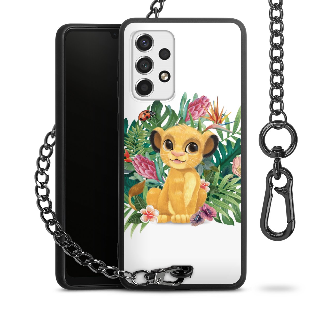 Die Handyhülle verfügt über eine mittig am unteren Rand platzierte Öse, an der die Metallkette stabil befestigt ist. Bestelle die Hülle einfach für Dein Smartphone-Modell, dann passt sie wie angegossen und Du brauchst sie bloß einmal anzudrücken. Handy in die Tasche, Karabiner an den Hosenbund – schon kann die Party starten.