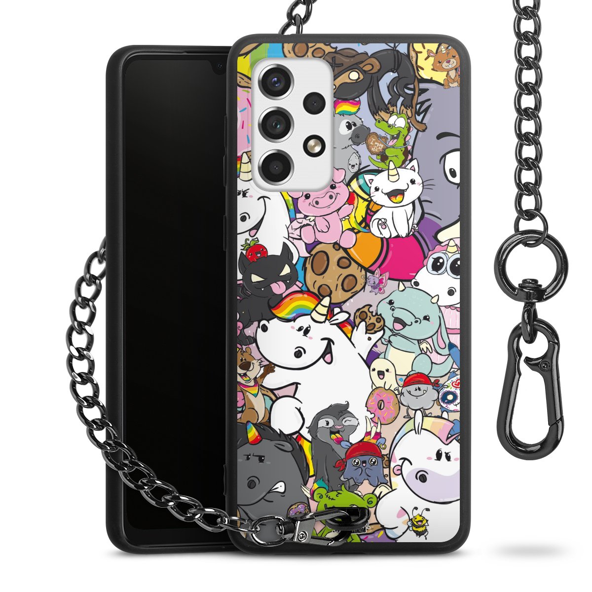 Die Handyhülle verfügt über eine mittig am unteren Rand platzierte Öse, an der die Metallkette stabil befestigt ist. Bestelle die Hülle einfach für Dein Smartphone-Modell, dann passt sie wie angegossen und Du brauchst sie bloß einmal anzudrücken. Handy in die Tasche, Karabiner an den Hosenbund – schon kann die Party starten.