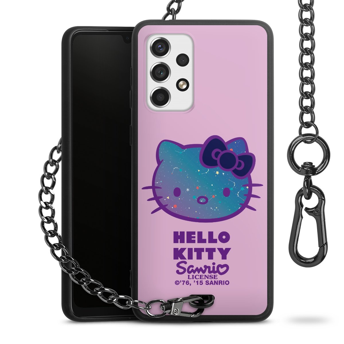 Die Handyhülle verfügt über eine mittig am unteren Rand platzierte Öse, an der die Metallkette stabil befestigt ist. Bestelle die Hülle einfach für Dein Smartphone-Modell, dann passt sie wie angegossen und Du brauchst sie bloß einmal anzudrücken. Handy in die Tasche, Karabiner an den Hosenbund – schon kann die Party starten.