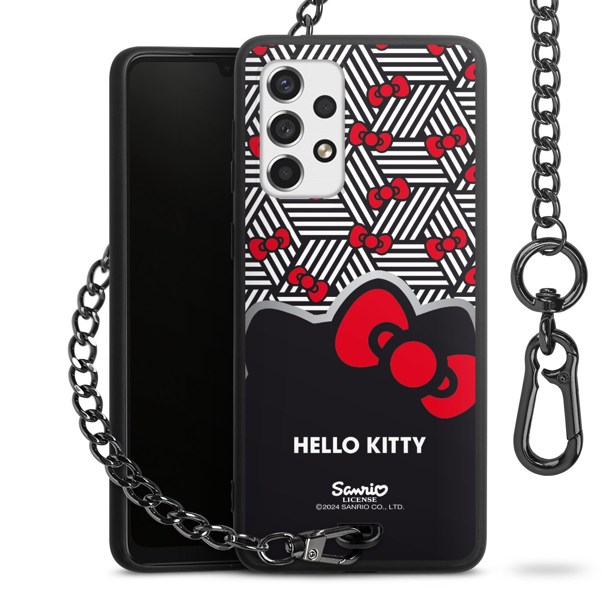 Die Handyhülle verfügt über eine mittig am unteren Rand platzierte Öse, an der die Metallkette stabil befestigt ist. Bestelle die Hülle einfach für Dein Smartphone-Modell, dann passt sie wie angegossen und Du brauchst sie bloß einmal anzudrücken. Handy in die Tasche, Karabiner an den Hosenbund – schon kann die Party starten.