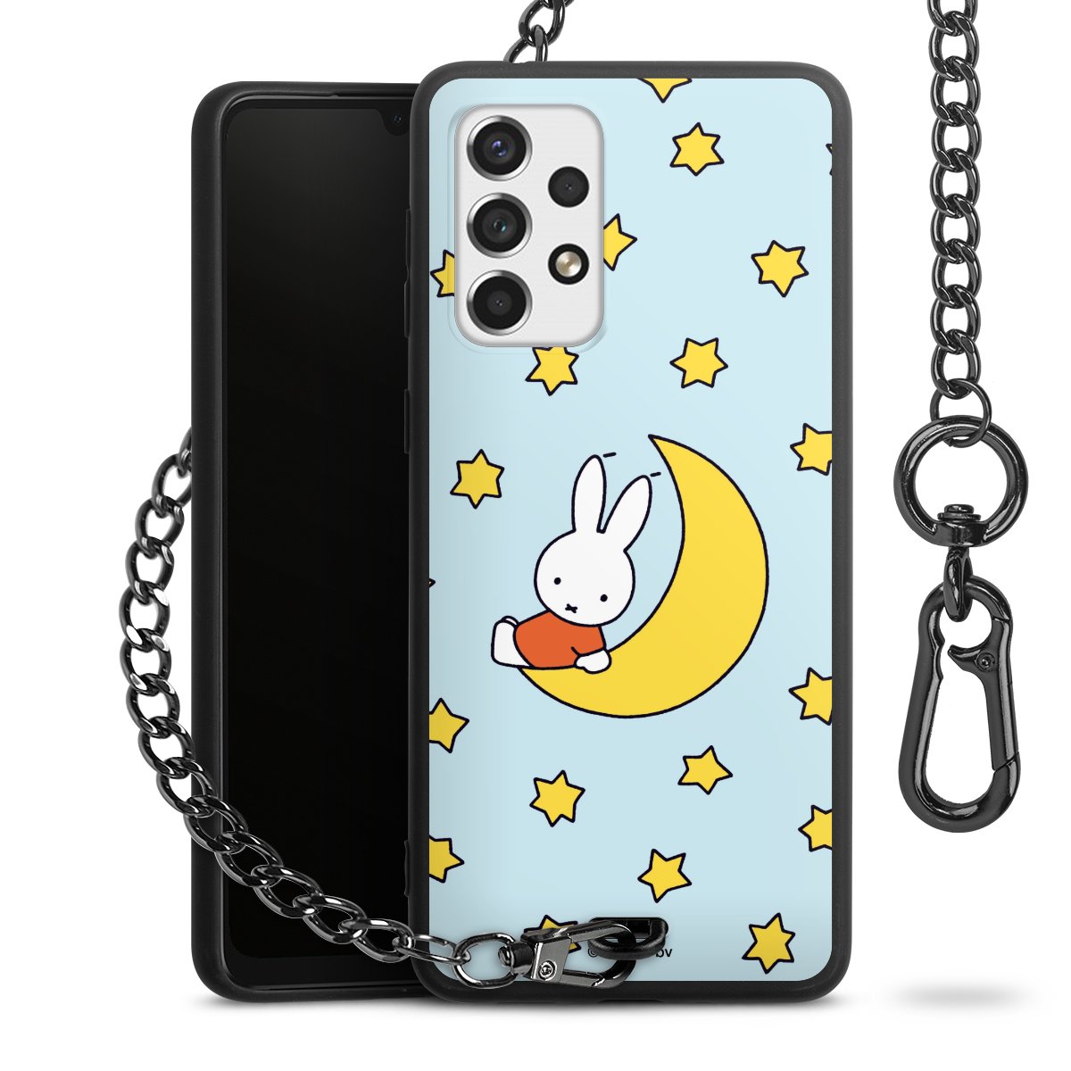 Die Handyhülle verfügt über eine mittig am unteren Rand platzierte Öse, an der die Metallkette stabil befestigt ist. Bestelle die Hülle einfach für Dein Smartphone-Modell, dann passt sie wie angegossen und Du brauchst sie bloß einmal anzudrücken. Handy in die Tasche, Karabiner an den Hosenbund – schon kann die Party starten.