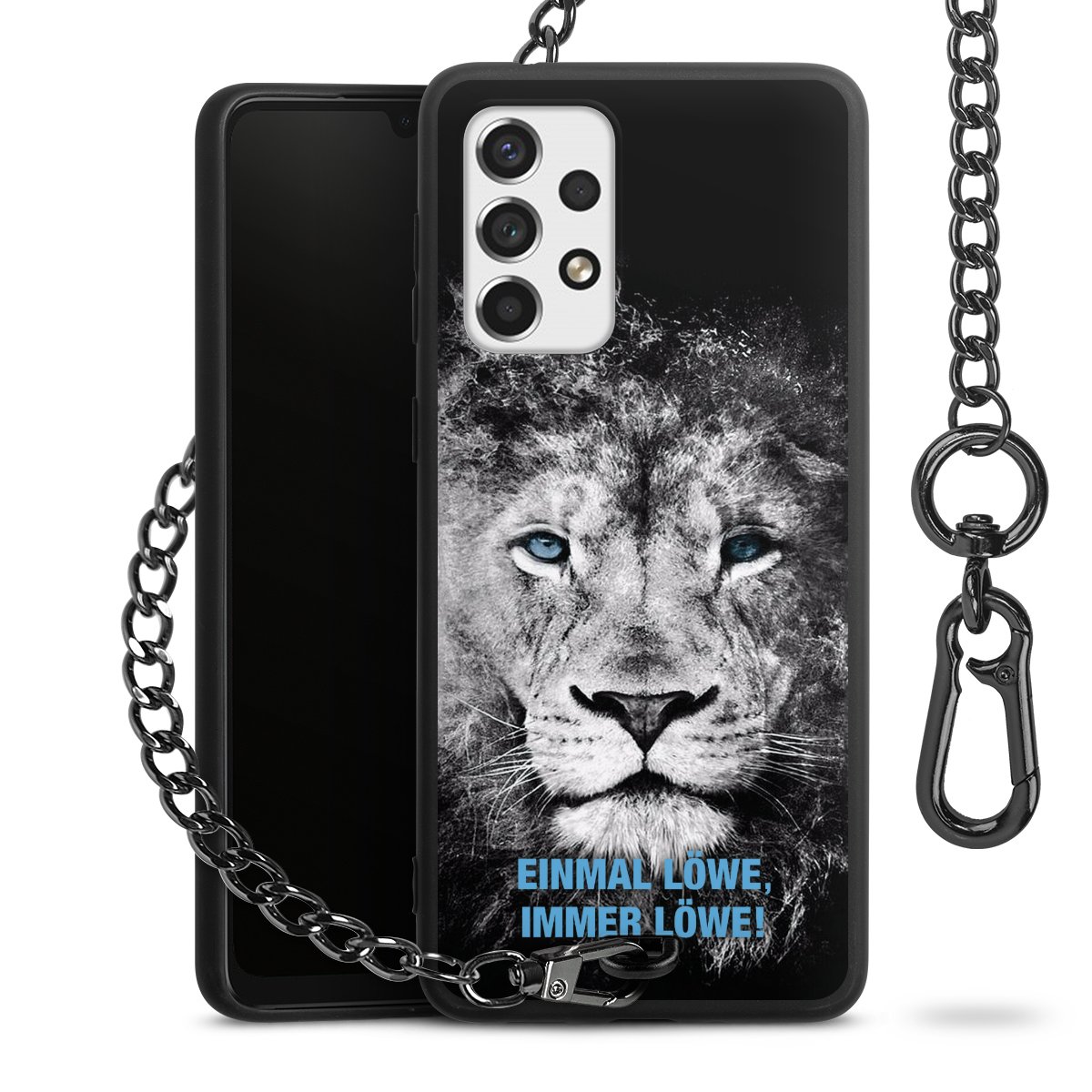 Die Handyhülle verfügt über eine mittig am unteren Rand platzierte Öse, an der die Metallkette stabil befestigt ist. Bestelle die Hülle einfach für Dein Smartphone-Modell, dann passt sie wie angegossen und Du brauchst sie bloß einmal anzudrücken. Handy in die Tasche, Karabiner an den Hosenbund – schon kann die Party starten.