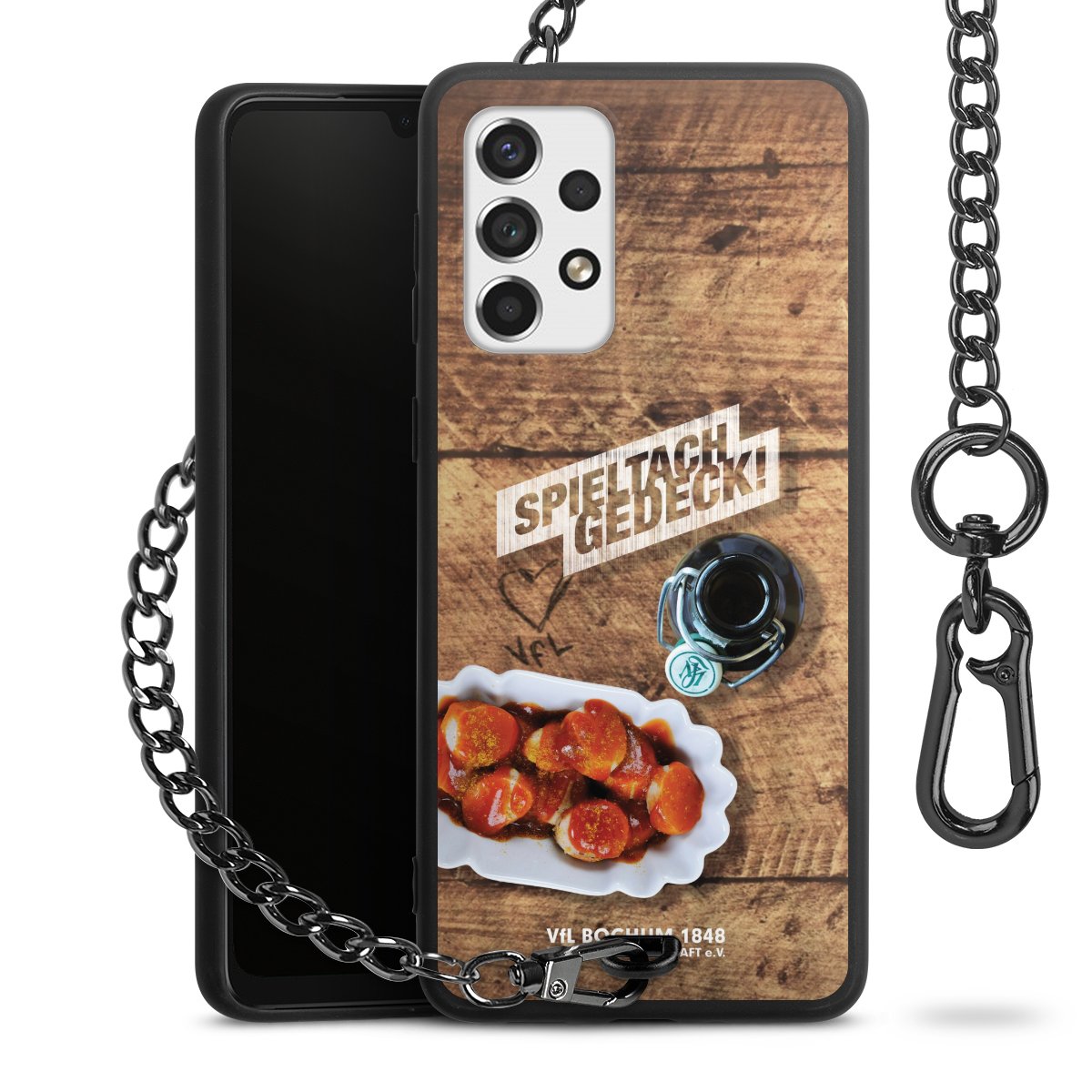 Die mattschwarze Silikon-Handyhülle besteht aus robustem TPU (thermoplastisches Polyurethan). Sie ist flexibel und schützt Dein Smartphone vor Stößen und Kratzern. Die Kette sowie der Karabinerhaken sind aus Metall in Gunmetal-Optik gefertigt. Für dieses Produkt kommen ausschließlich TÜV-geprüfte Materialien zum Einsatz.