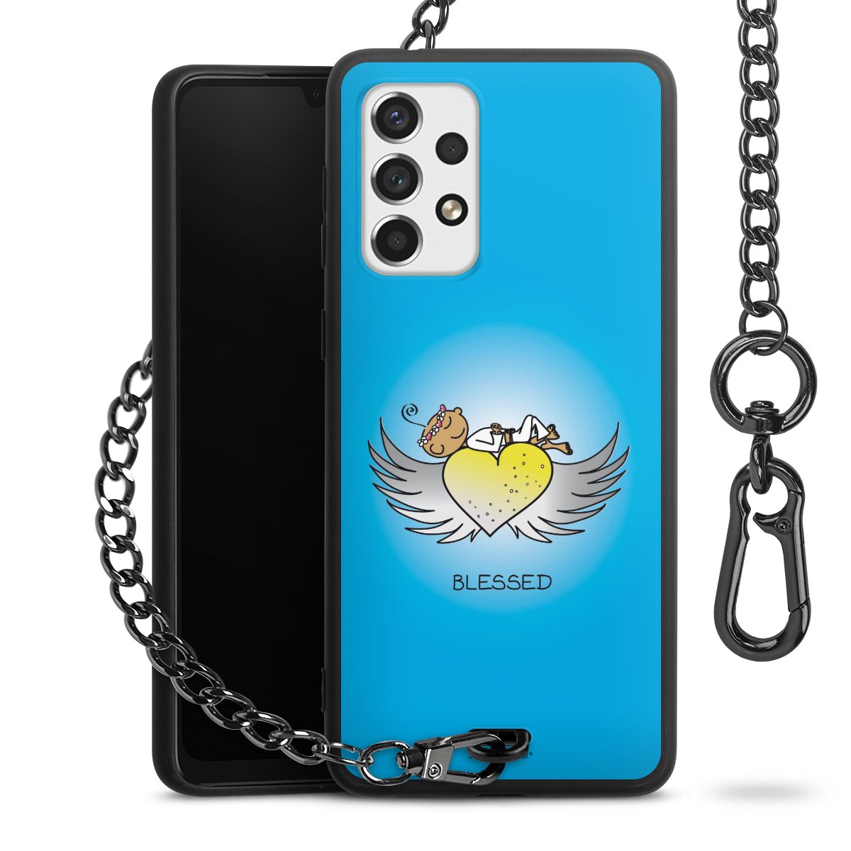 Die mattschwarze Silikon-Handyhülle besteht aus robustem TPU (thermoplastisches Polyurethan). Sie ist flexibel und schützt Dein Smartphone vor Stößen und Kratzern. Die Kette sowie der Karabinerhaken sind aus Metall in Gunmetal-Optik gefertigt. Für dieses Produkt kommen ausschließlich TÜV-geprüfte Materialien zum Einsatz.