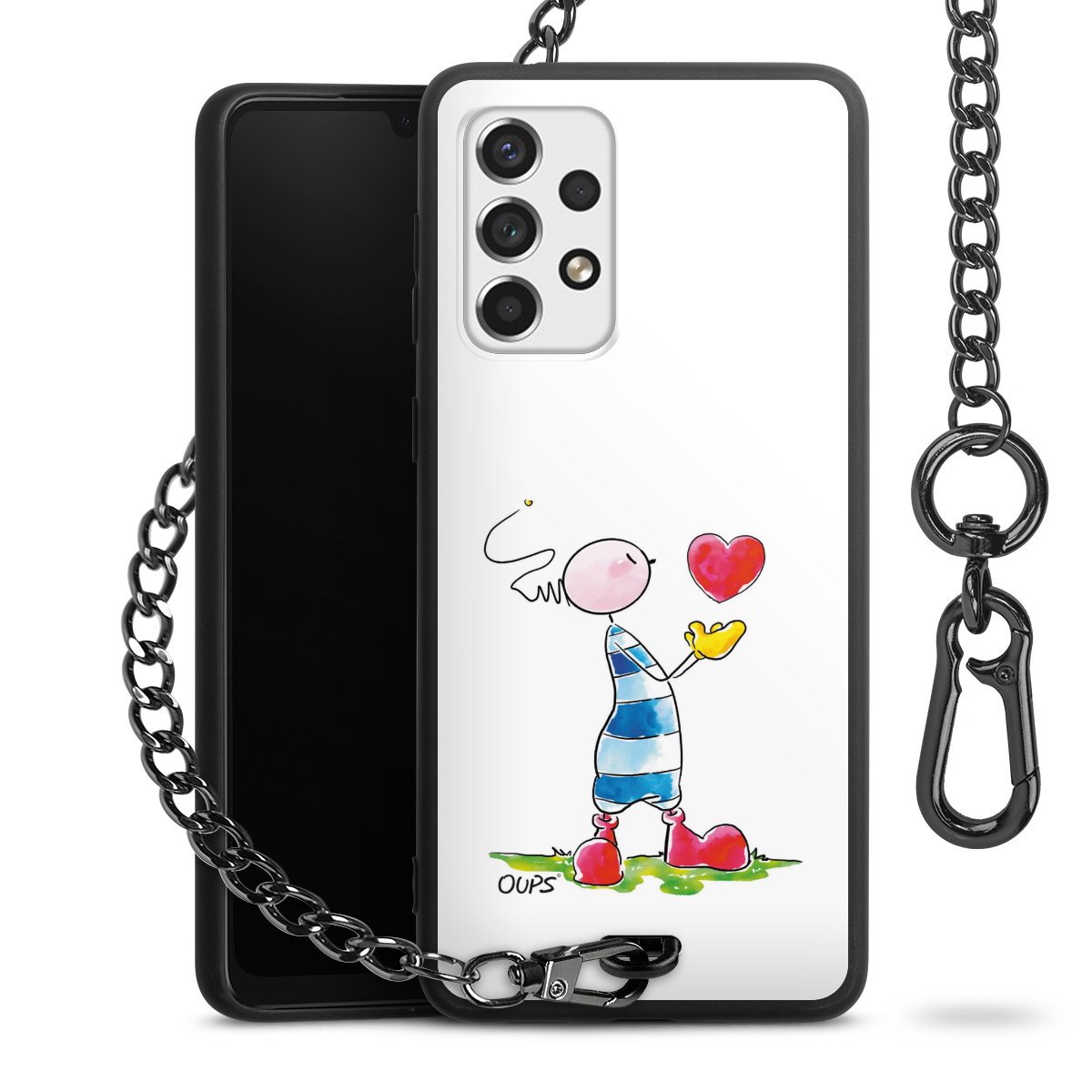 Die Handyhülle verfügt über eine mittig am unteren Rand platzierte Öse, an der die Metallkette stabil befestigt ist. Bestelle die Hülle einfach für Dein Smartphone-Modell, dann passt sie wie angegossen und Du brauchst sie bloß einmal anzudrücken. Handy in die Tasche, Karabiner an den Hosenbund – schon kann die Party starten.