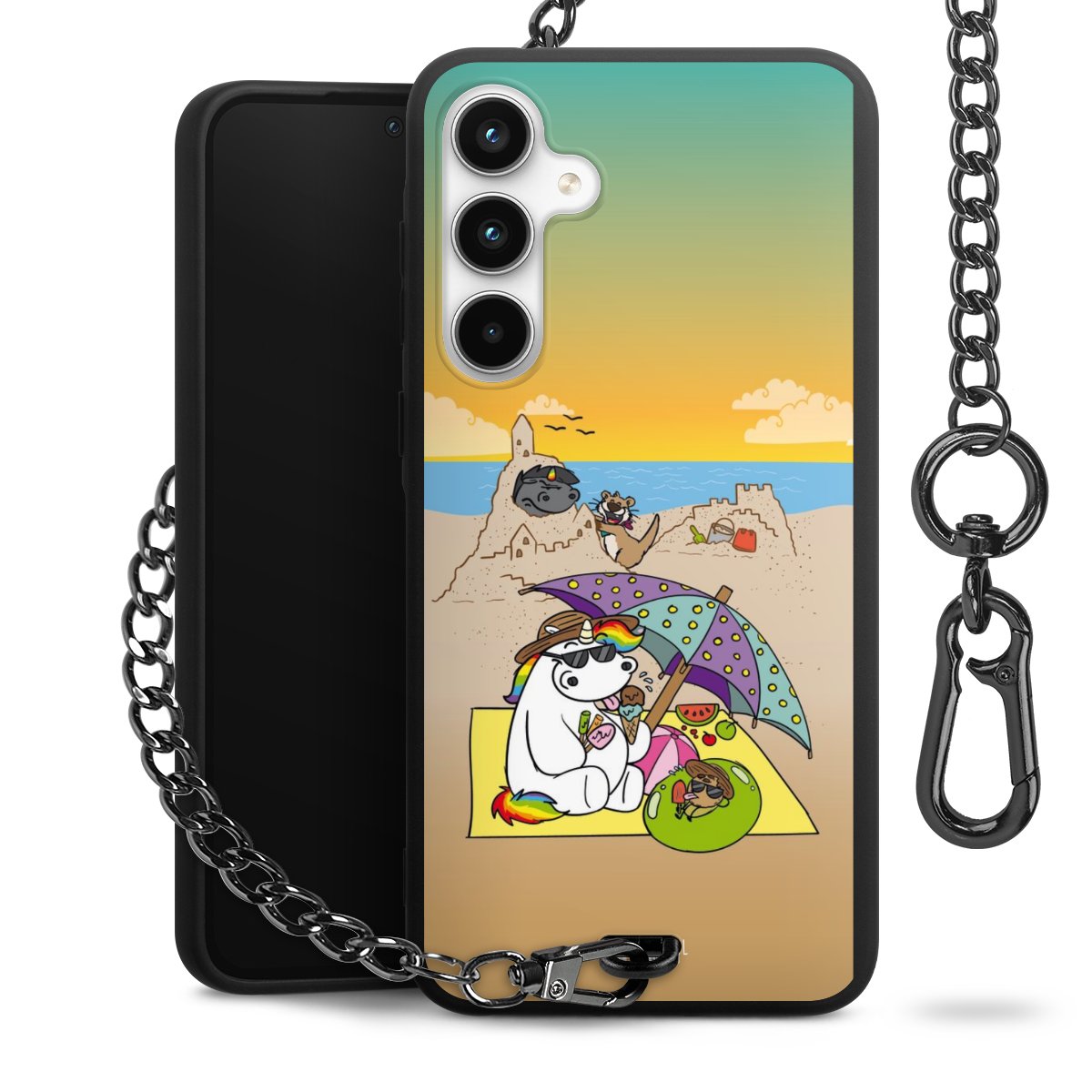 Die Handyhülle verfügt über eine mittig am unteren Rand platzierte Öse, an der die Metallkette stabil befestigt ist. Bestelle die Hülle einfach für Dein Smartphone-Modell, dann passt sie wie angegossen und Du brauchst sie bloß einmal anzudrücken. Handy in die Tasche, Karabiner an den Hosenbund – schon kann die Party starten.