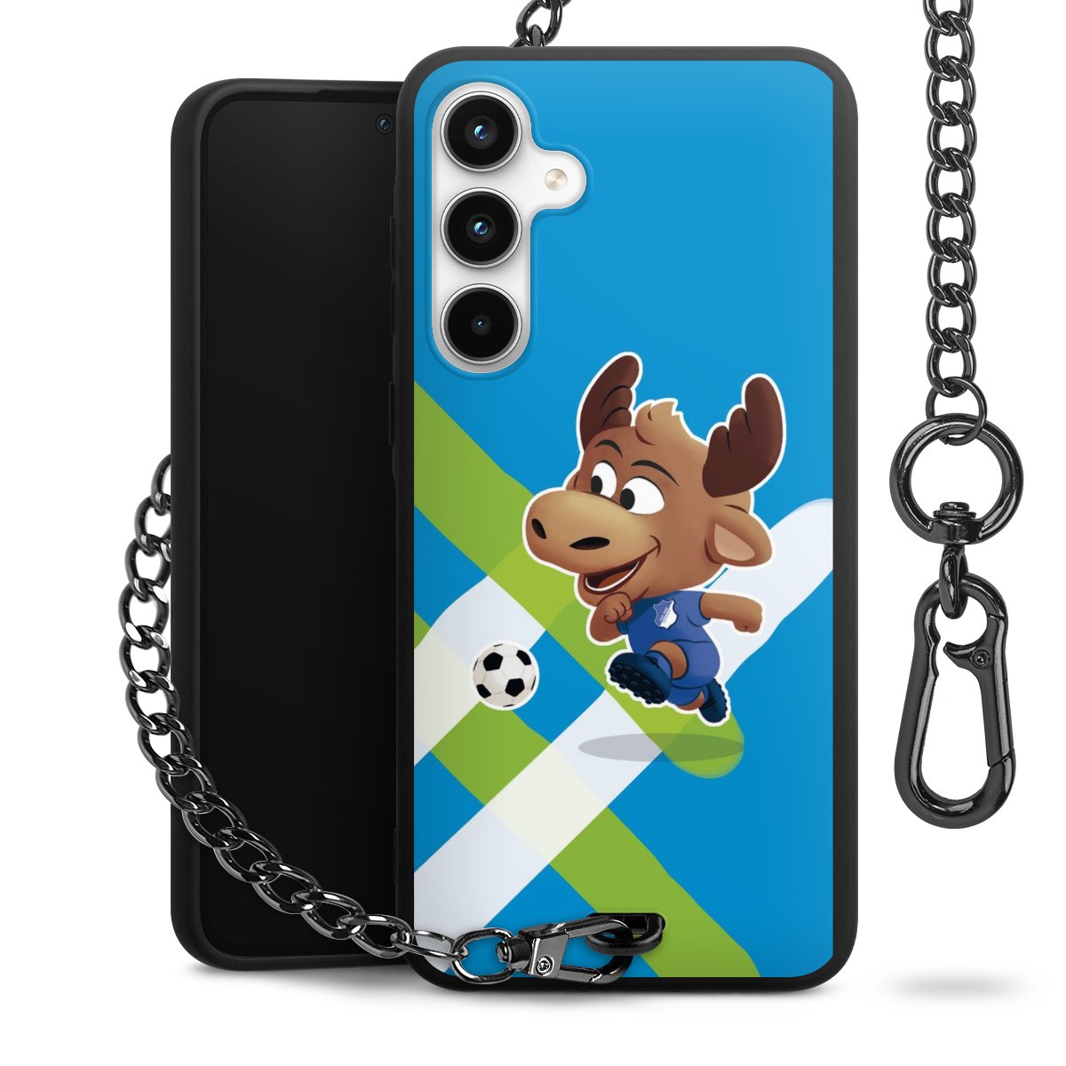 Die Handyhülle verfügt über eine mittig am unteren Rand platzierte Öse, an der die Metallkette stabil befestigt ist. Bestelle die Hülle einfach für Dein Smartphone-Modell, dann passt sie wie angegossen und Du brauchst sie bloß einmal anzudrücken. Handy in die Tasche, Karabiner an den Hosenbund – schon kann die Party starten.