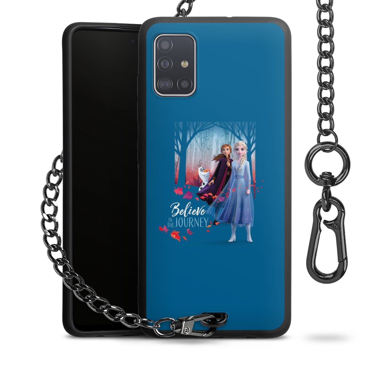 Die Handyhülle verfügt über eine mittig am unteren Rand platzierte Öse, an der die Metallkette stabil befestigt ist. Bestelle die Hülle einfach für Dein Smartphone-Modell, dann passt sie wie angegossen und Du brauchst sie bloß einmal anzudrücken. Handy in die Tasche, Karabiner an den Hosenbund – schon kann die Party starten.