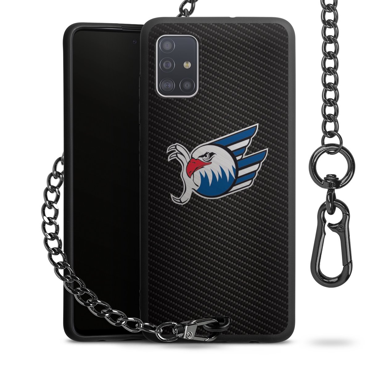 Die mattschwarze Silikon-Handyhülle besteht aus robustem TPU (thermoplastisches Polyurethan). Sie ist flexibel und schützt Dein Smartphone vor Stößen und Kratzern. Die Kette sowie der Karabinerhaken sind aus Metall in Gunmetal-Optik gefertigt. Für dieses Produkt kommen ausschließlich TÜV-geprüfte Materialien zum Einsatz.