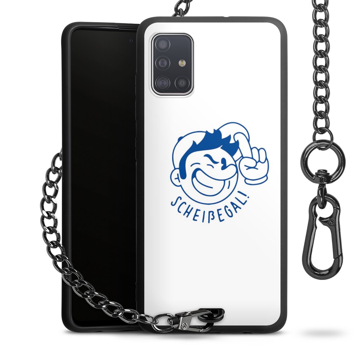 Die Handyhülle verfügt über eine mittig am unteren Rand platzierte Öse, an der die Metallkette stabil befestigt ist. Bestelle die Hülle einfach für Dein Smartphone-Modell, dann passt sie wie angegossen und Du brauchst sie bloß einmal anzudrücken. Handy in die Tasche, Karabiner an den Hosenbund – schon kann die Party starten.