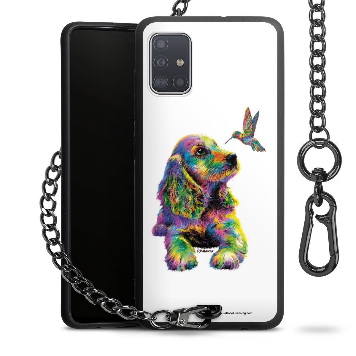 Die Handyhülle verfügt über eine mittig am unteren Rand platzierte Öse, an der die Metallkette stabil befestigt ist. Bestelle die Hülle einfach für Dein Smartphone-Modell, dann passt sie wie angegossen und Du brauchst sie bloß einmal anzudrücken. Handy in die Tasche, Karabiner an den Hosenbund – schon kann die Party starten.