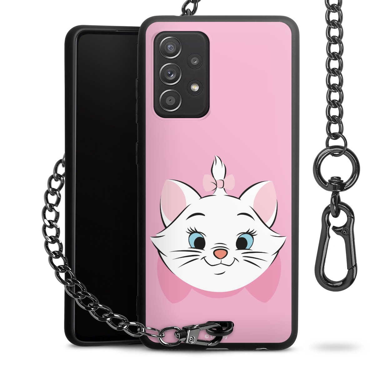 Die Handyhülle verfügt über eine mittig am unteren Rand platzierte Öse, an der die Metallkette stabil befestigt ist. Bestelle die Hülle einfach für Dein Smartphone-Modell, dann passt sie wie angegossen und Du brauchst sie bloß einmal anzudrücken. Handy in die Tasche, Karabiner an den Hosenbund – schon kann die Party starten.