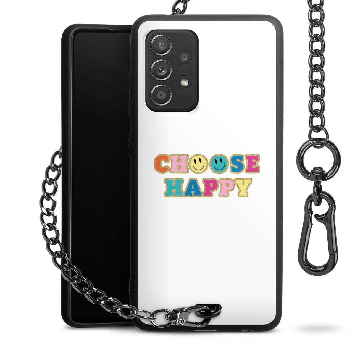 Die Handyhülle verfügt über eine mittig am unteren Rand platzierte Öse, an der die Metallkette stabil befestigt ist. Bestelle die Hülle einfach für Dein Smartphone-Modell, dann passt sie wie angegossen und Du brauchst sie bloß einmal anzudrücken. Handy in die Tasche, Karabiner an den Hosenbund – schon kann die Party starten.