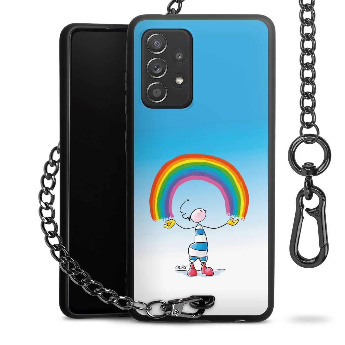 Die Handyhülle verfügt über eine mittig am unteren Rand platzierte Öse, an der die Metallkette stabil befestigt ist. Bestelle die Hülle einfach für Dein Smartphone-Modell, dann passt sie wie angegossen und Du brauchst sie bloß einmal anzudrücken. Handy in die Tasche, Karabiner an den Hosenbund – schon kann die Party starten.