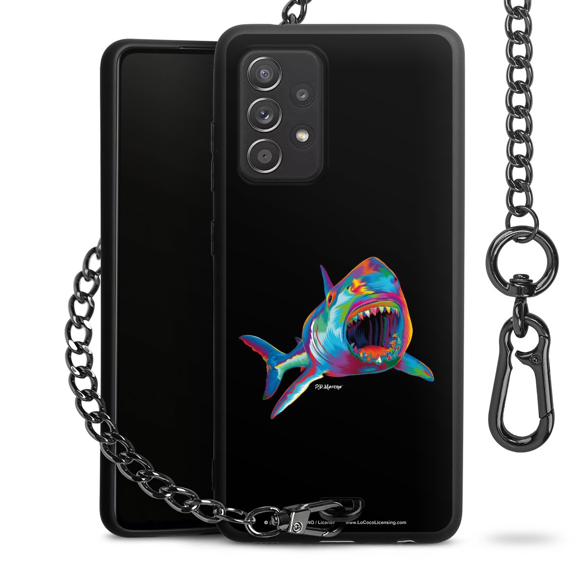 Die Handyhülle verfügt über eine mittig am unteren Rand platzierte Öse, an der die Metallkette stabil befestigt ist. Bestelle die Hülle einfach für Dein Smartphone-Modell, dann passt sie wie angegossen und Du brauchst sie bloß einmal anzudrücken. Handy in die Tasche, Karabiner an den Hosenbund – schon kann die Party starten.