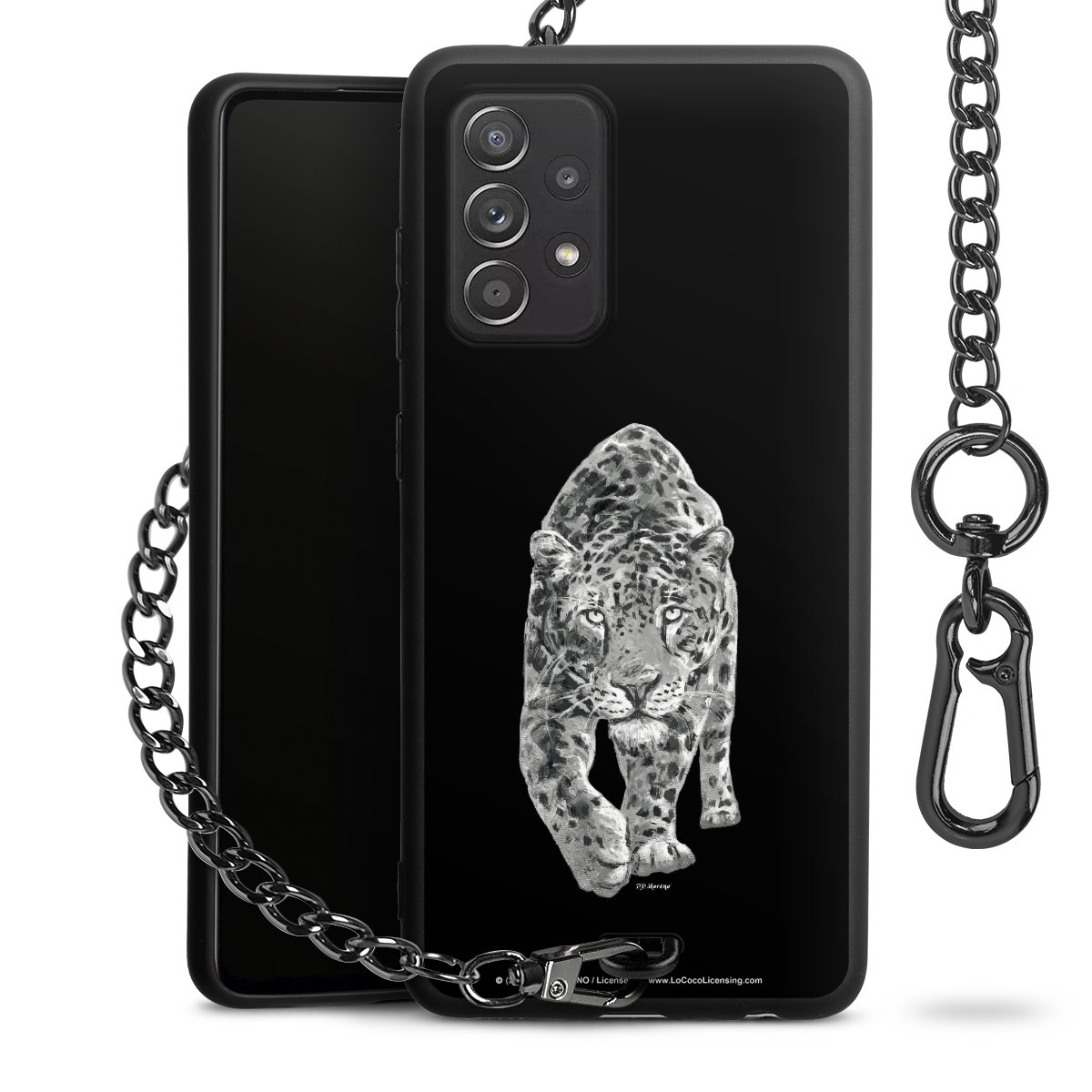 Die Handyhülle verfügt über eine mittig am unteren Rand platzierte Öse, an der die Metallkette stabil befestigt ist. Bestelle die Hülle einfach für Dein Smartphone-Modell, dann passt sie wie angegossen und Du brauchst sie bloß einmal anzudrücken. Handy in die Tasche, Karabiner an den Hosenbund – schon kann die Party starten.