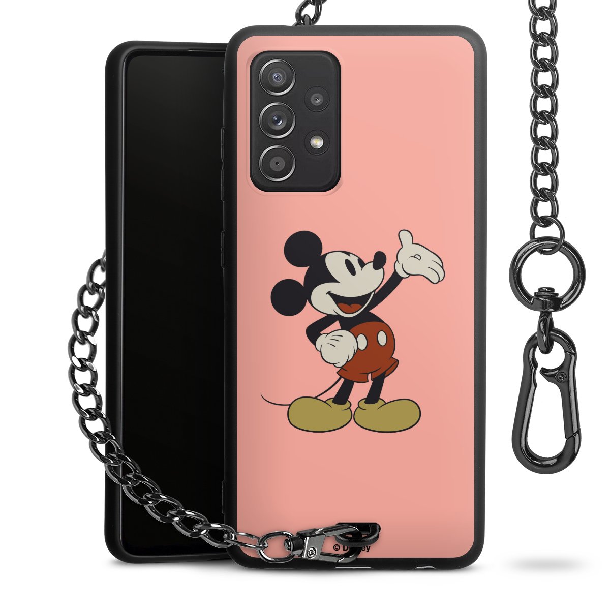 Die Handyhülle verfügt über eine mittig am unteren Rand platzierte Öse, an der die Metallkette stabil befestigt ist. Bestelle die Hülle einfach für Dein Smartphone-Modell, dann passt sie wie angegossen und Du brauchst sie bloß einmal anzudrücken. Handy in die Tasche, Karabiner an den Hosenbund – schon kann die Party starten.