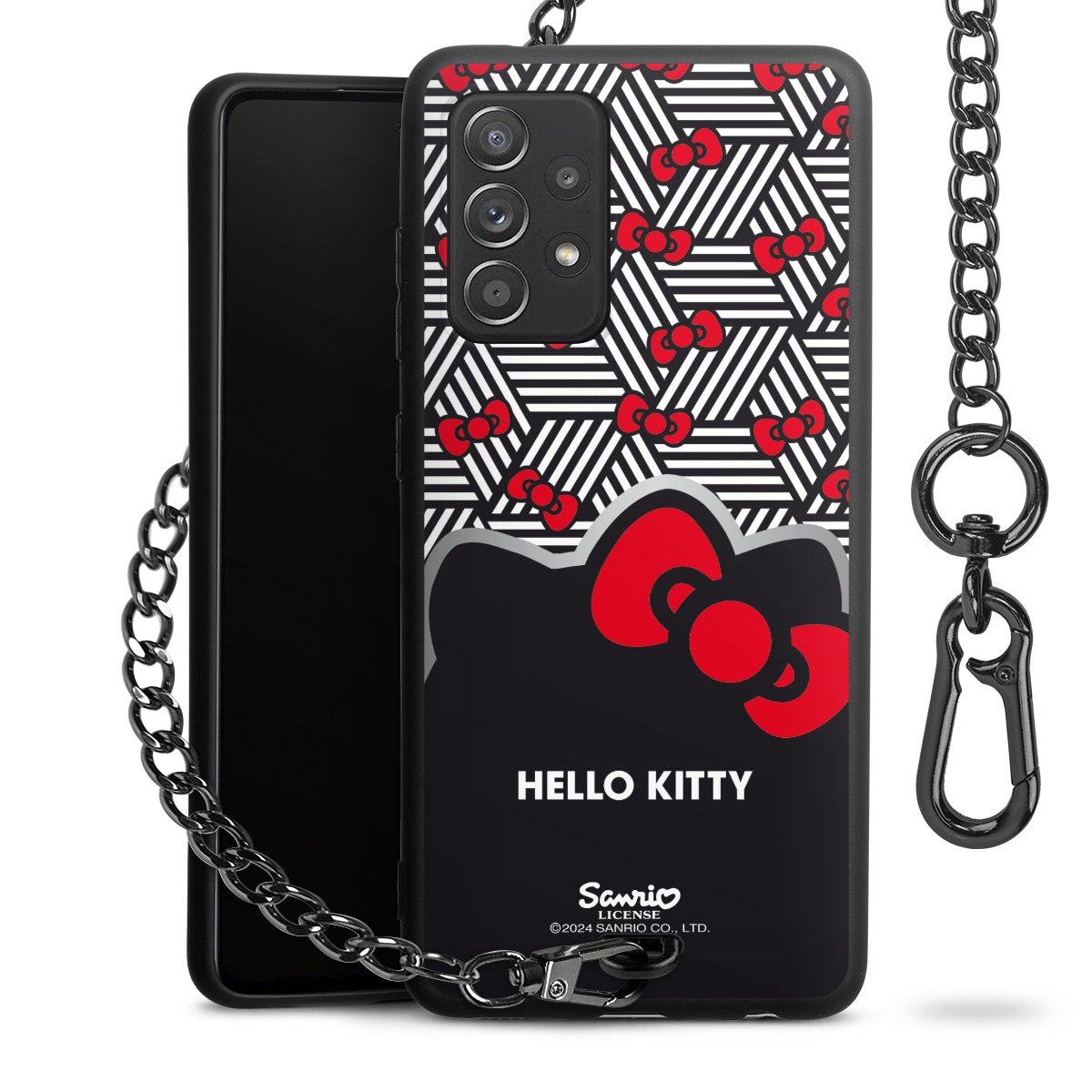 Die Handyhülle verfügt über eine mittig am unteren Rand platzierte Öse, an der die Metallkette stabil befestigt ist. Bestelle die Hülle einfach für Dein Smartphone-Modell, dann passt sie wie angegossen und Du brauchst sie bloß einmal anzudrücken. Handy in die Tasche, Karabiner an den Hosenbund – schon kann die Party starten.