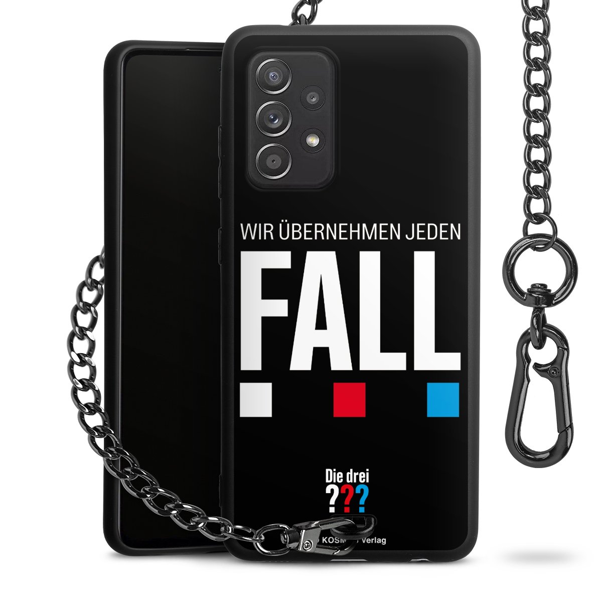 Die Handyhülle verfügt über eine mittig am unteren Rand platzierte Öse, an der die Metallkette stabil befestigt ist. Bestelle die Hülle einfach für Dein Smartphone-Modell, dann passt sie wie angegossen und Du brauchst sie bloß einmal anzudrücken. Handy in die Tasche, Karabiner an den Hosenbund – schon kann die Party starten.