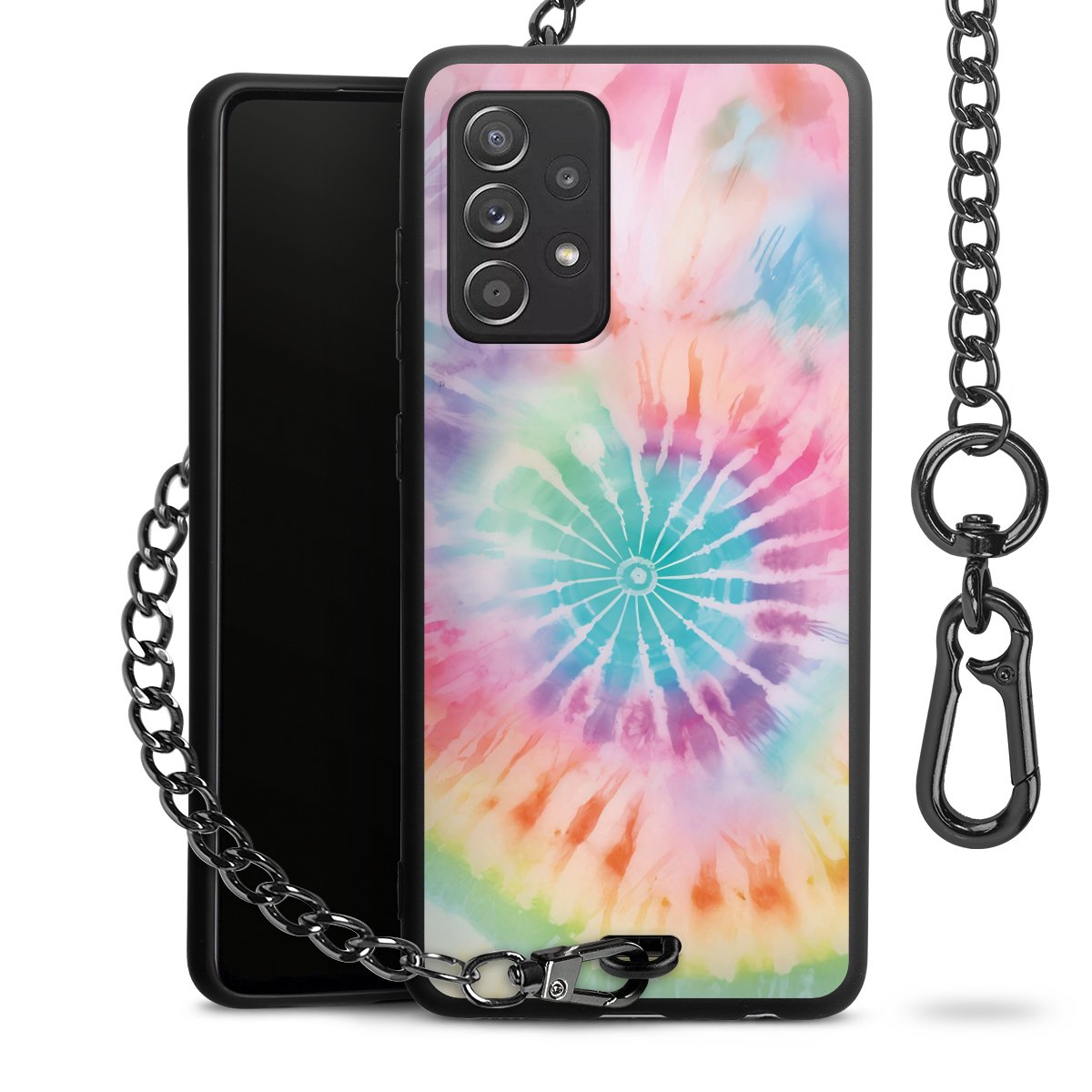Die Handyhülle verfügt über eine mittig am unteren Rand platzierte Öse, an der die Metallkette stabil befestigt ist. Bestelle die Hülle einfach für Dein Smartphone-Modell, dann passt sie wie angegossen und Du brauchst sie bloß einmal anzudrücken. Handy in die Tasche, Karabiner an den Hosenbund – schon kann die Party starten.