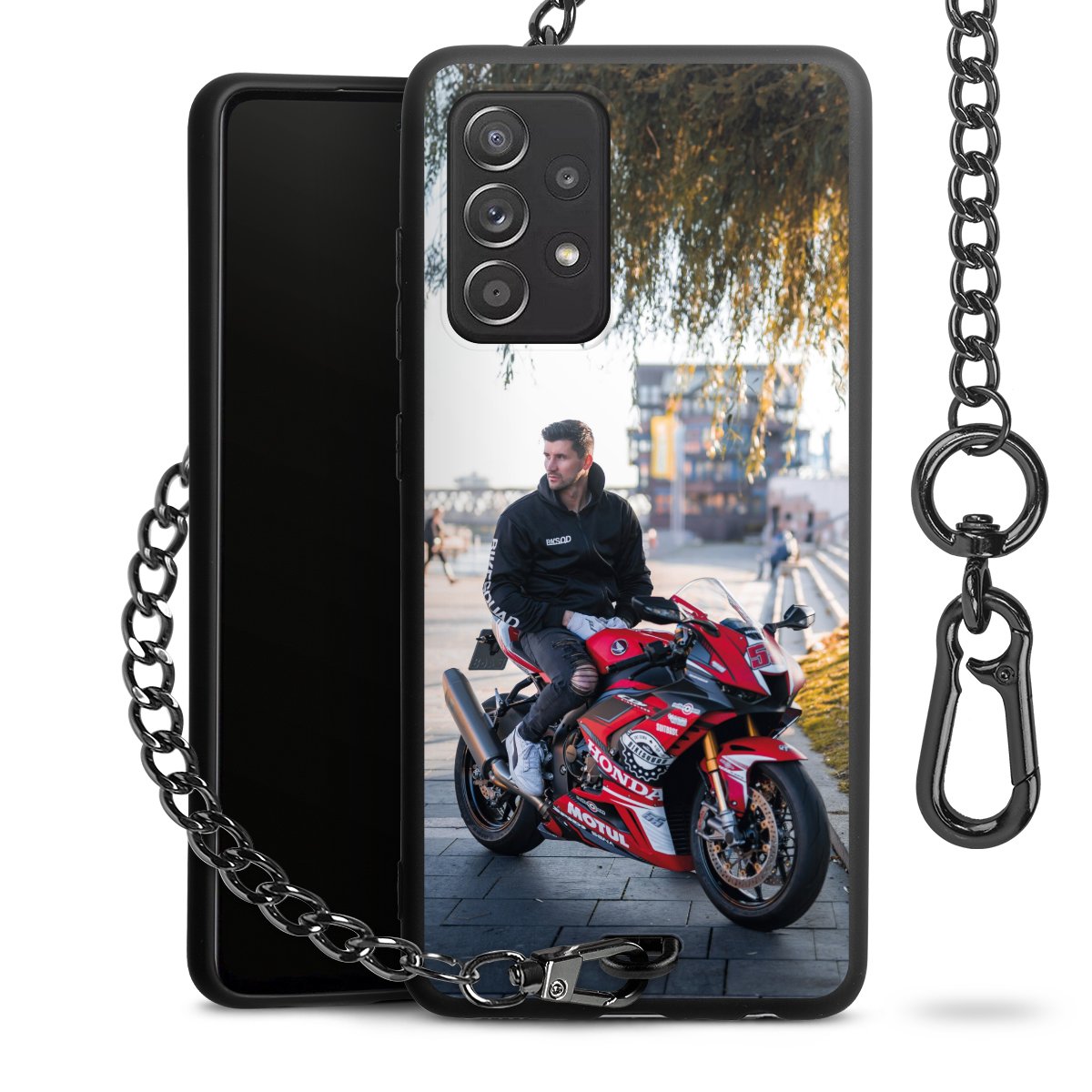 Die Handyhülle verfügt über eine mittig am unteren Rand platzierte Öse, an der die Metallkette stabil befestigt ist. Bestelle die Hülle einfach für Dein Smartphone-Modell, dann passt sie wie angegossen und Du brauchst sie bloß einmal anzudrücken. Handy in die Tasche, Karabiner an den Hosenbund – schon kann die Party starten.