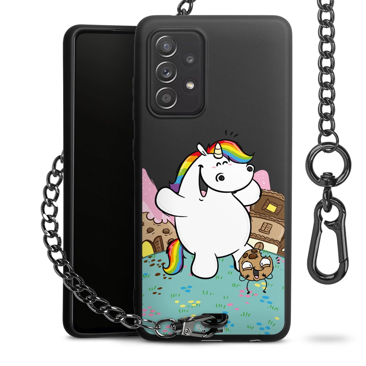 Die Handyhülle verfügt über eine mittig am unteren Rand platzierte Öse, an der die Metallkette stabil befestigt ist. Bestelle die Hülle einfach für Dein Smartphone-Modell, dann passt sie wie angegossen und Du brauchst sie bloß einmal anzudrücken. Handy in die Tasche, Karabiner an den Hosenbund – schon kann die Party starten.