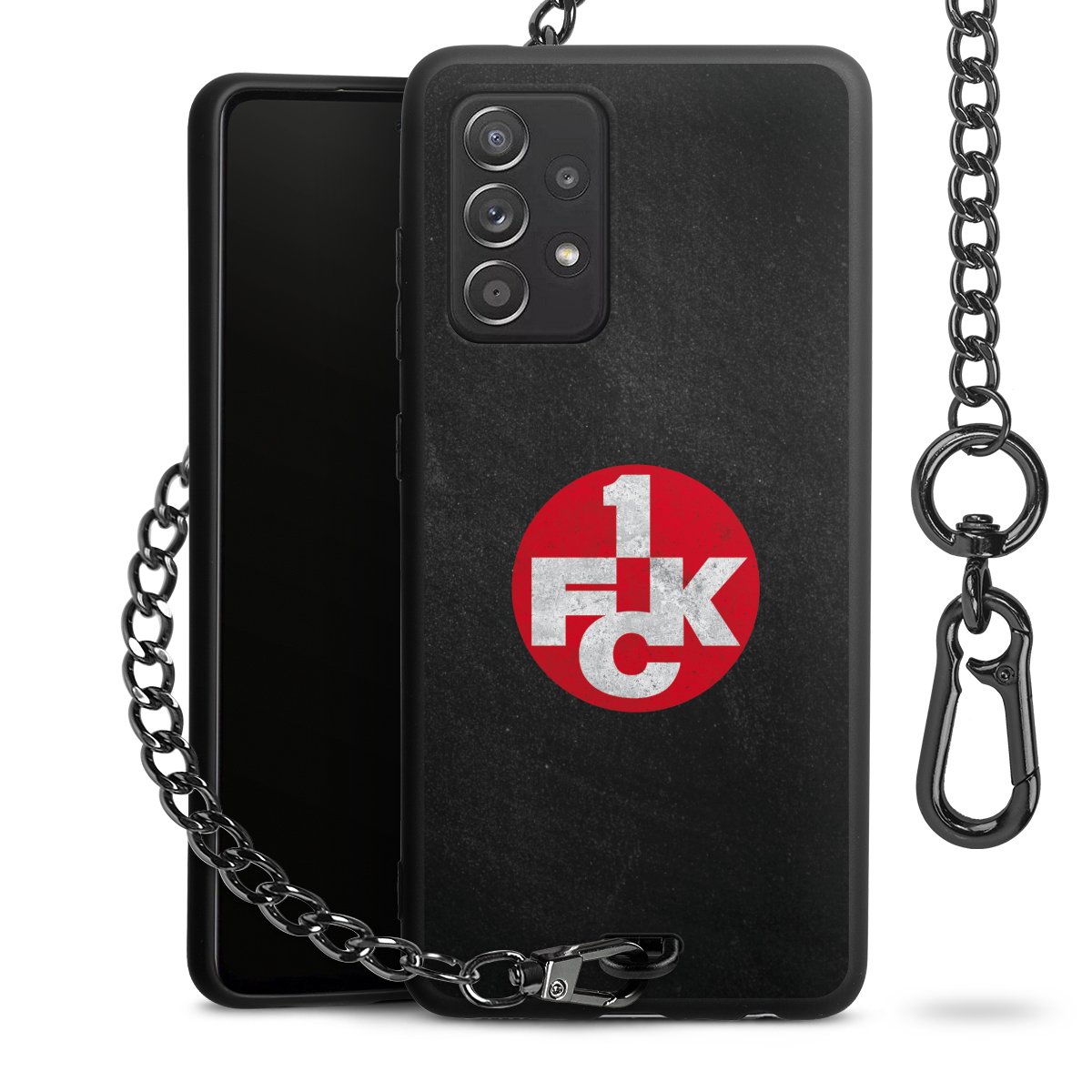 Die Handyhülle verfügt über eine mittig am unteren Rand platzierte Öse, an der die Metallkette stabil befestigt ist. Bestelle die Hülle einfach für Dein Smartphone-Modell, dann passt sie wie angegossen und Du brauchst sie bloß einmal anzudrücken. Handy in die Tasche, Karabiner an den Hosenbund – schon kann die Party starten.