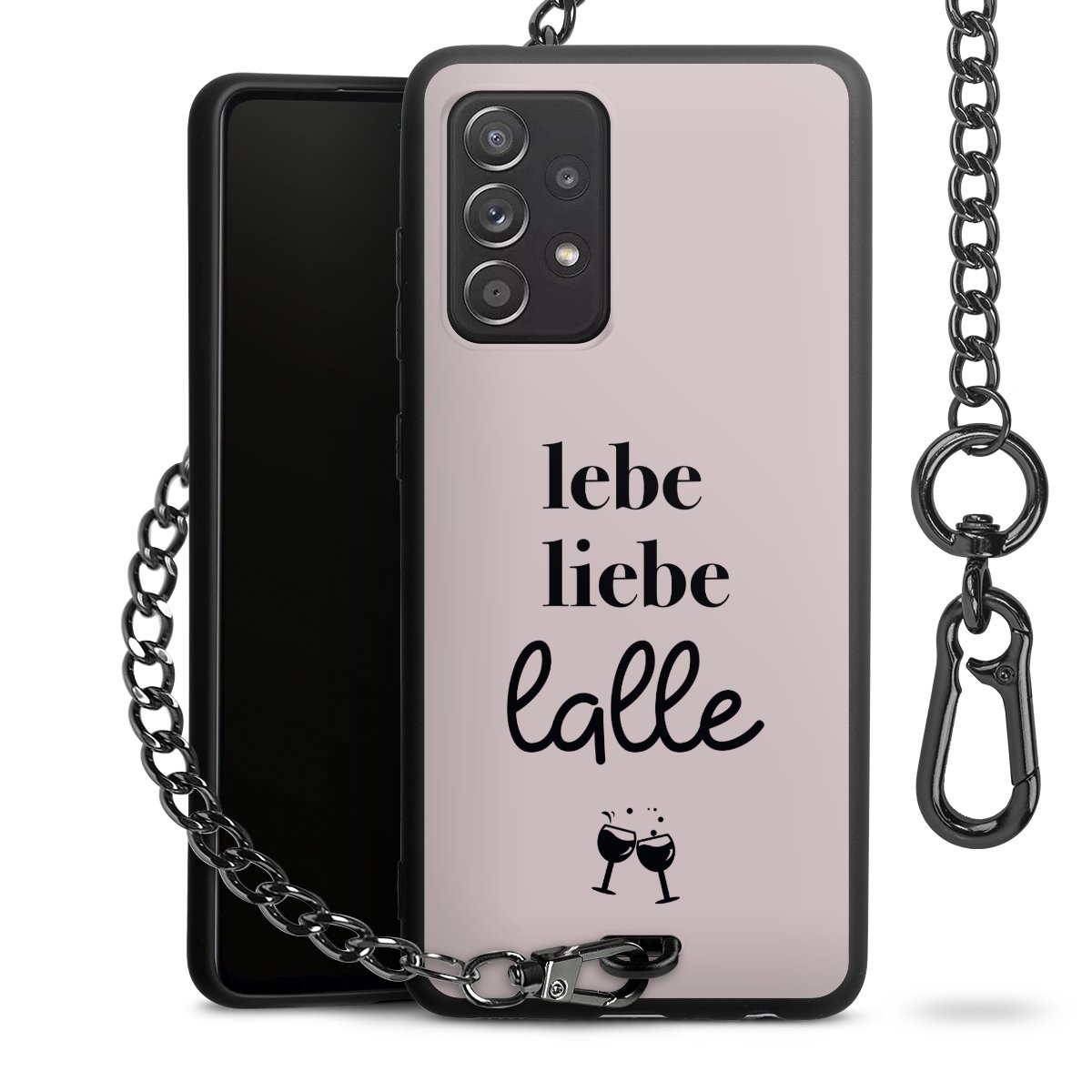 Die Handyhülle verfügt über eine mittig am unteren Rand platzierte Öse, an der die Metallkette stabil befestigt ist. Bestelle die Hülle einfach für Dein Smartphone-Modell, dann passt sie wie angegossen und Du brauchst sie bloß einmal anzudrücken. Handy in die Tasche, Karabiner an den Hosenbund – schon kann die Party starten.