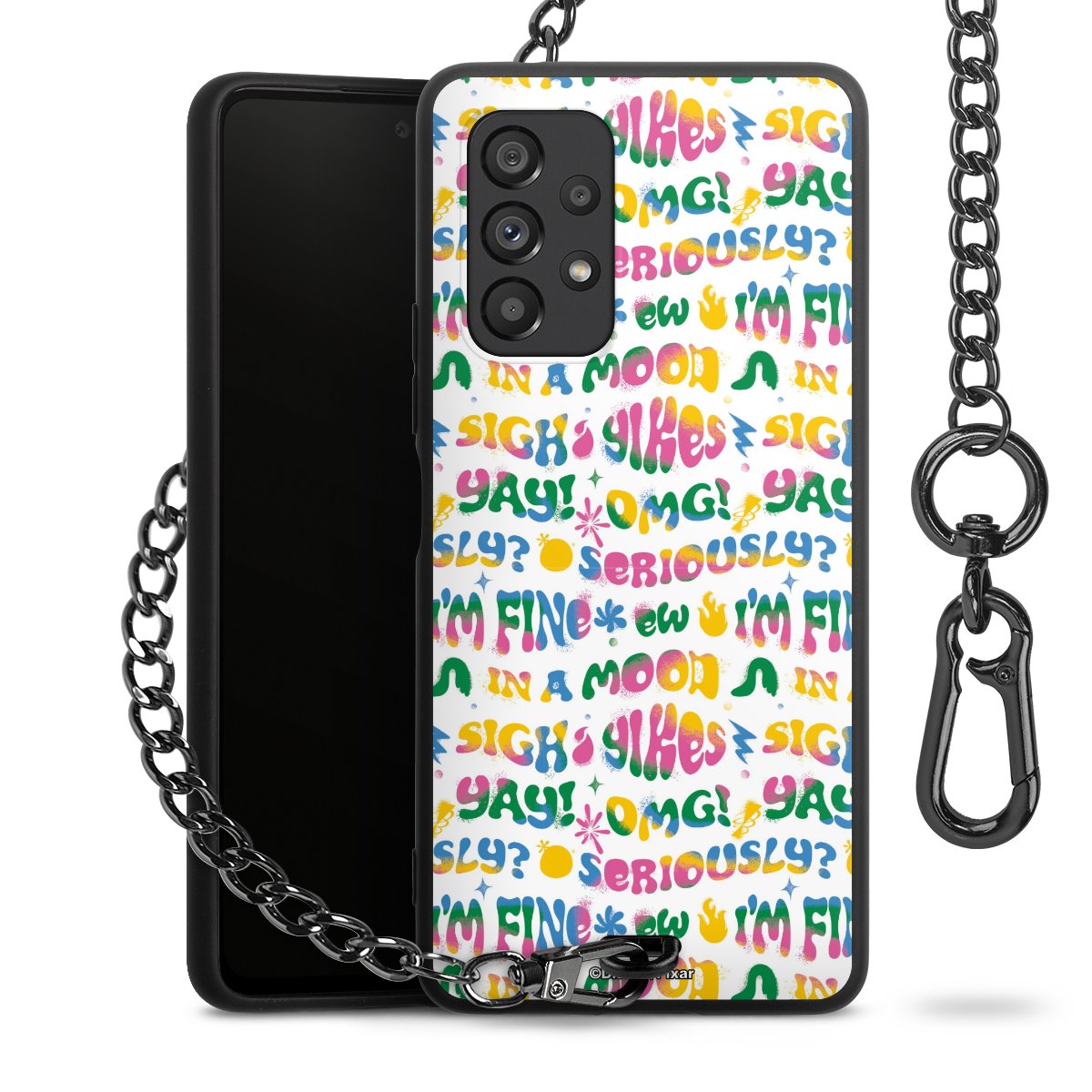 Die Handyhülle verfügt über eine mittig am unteren Rand platzierte Öse, an der die Metallkette stabil befestigt ist. Bestelle die Hülle einfach für Dein Smartphone-Modell, dann passt sie wie angegossen und Du brauchst sie bloß einmal anzudrücken. Handy in die Tasche, Karabiner an den Hosenbund – schon kann die Party starten.