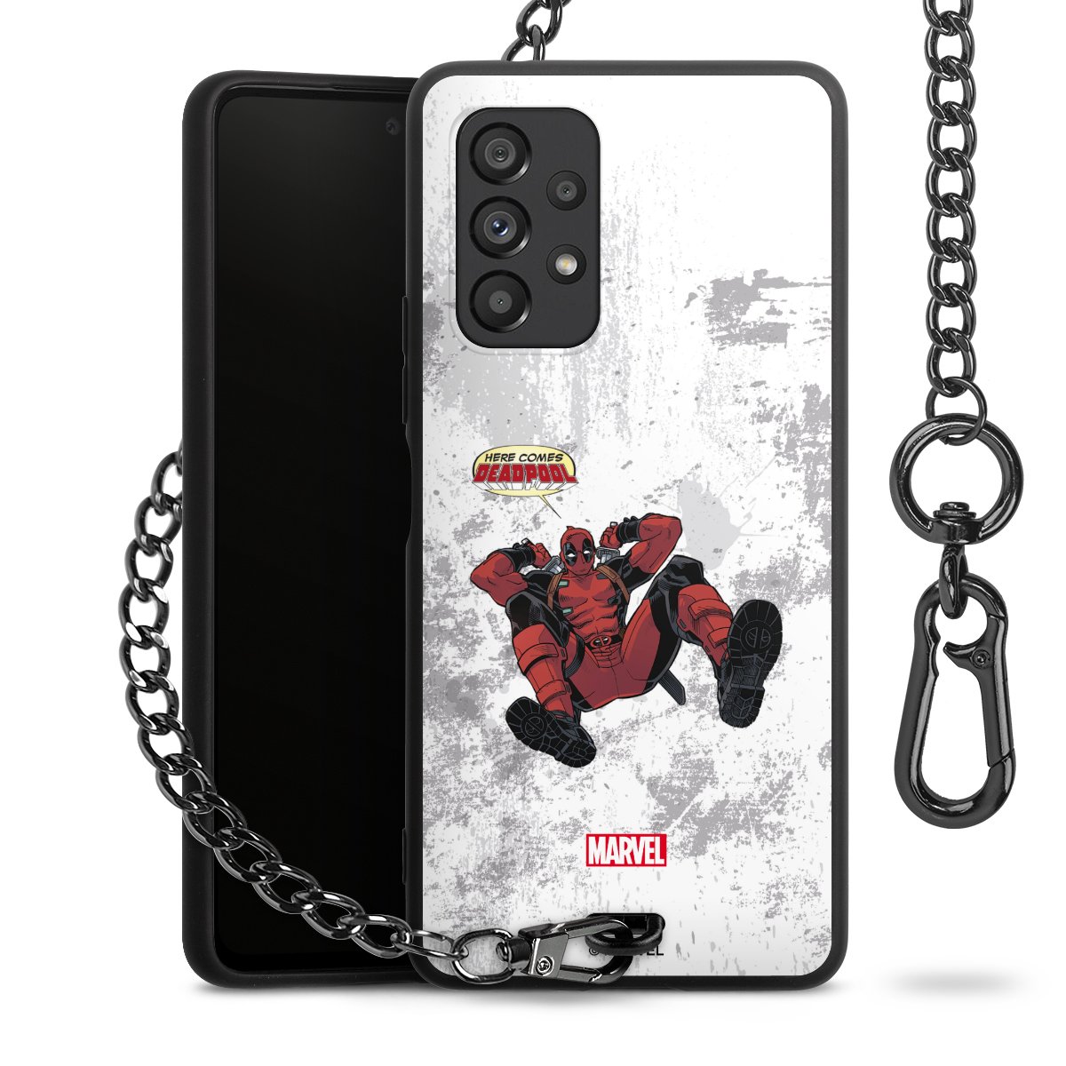 Die mattschwarze Silikon-Handyhülle besteht aus robustem TPU (thermoplastisches Polyurethan). Sie ist flexibel und schützt Dein Smartphone vor Stößen und Kratzern. Die Kette sowie der Karabinerhaken sind aus Metall in Gunmetal-Optik gefertigt. Für dieses Produkt kommen ausschließlich TÜV-geprüfte Materialien zum Einsatz.