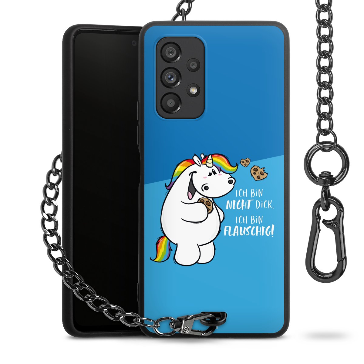 Die Handyhülle verfügt über eine mittig am unteren Rand platzierte Öse, an der die Metallkette stabil befestigt ist. Bestelle die Hülle einfach für Dein Smartphone-Modell, dann passt sie wie angegossen und Du brauchst sie bloß einmal anzudrücken. Handy in die Tasche, Karabiner an den Hosenbund – schon kann die Party starten.