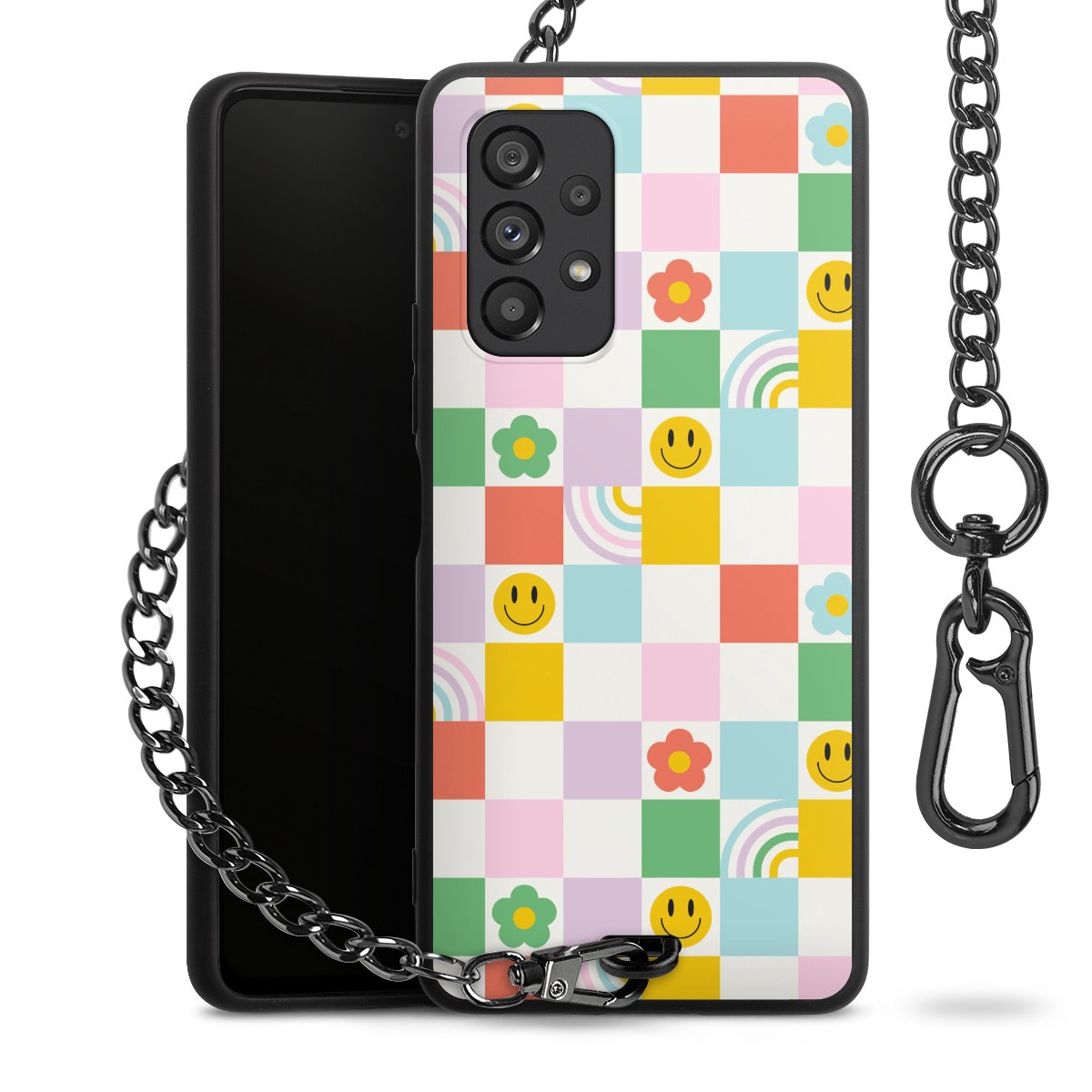 Die mattschwarze Silikon-Handyhülle besteht aus robustem TPU (thermoplastisches Polyurethan). Sie ist flexibel und schützt Dein Smartphone vor Stößen und Kratzern. Die Kette sowie der Karabinerhaken sind aus Metall in Gunmetal-Optik gefertigt. Für dieses Produkt kommen ausschließlich TÜV-geprüfte Materialien zum Einsatz.