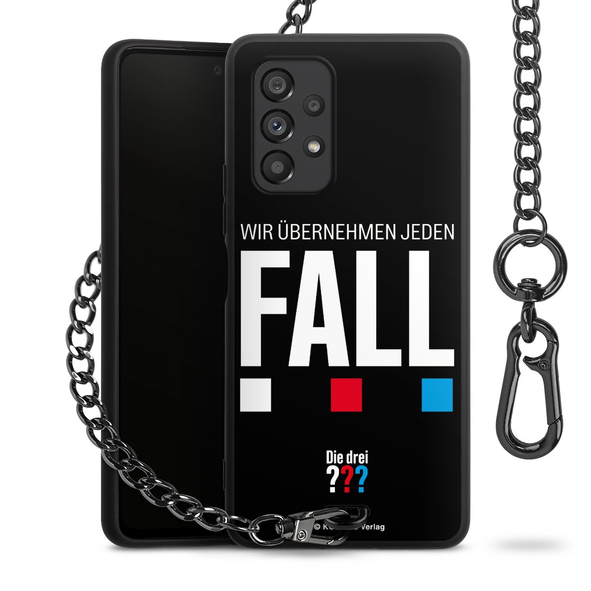 Die Handyhülle verfügt über eine mittig am unteren Rand platzierte Öse, an der die Metallkette stabil befestigt ist. Bestelle die Hülle einfach für Dein Smartphone-Modell, dann passt sie wie angegossen und Du brauchst sie bloß einmal anzudrücken. Handy in die Tasche, Karabiner an den Hosenbund – schon kann die Party starten.