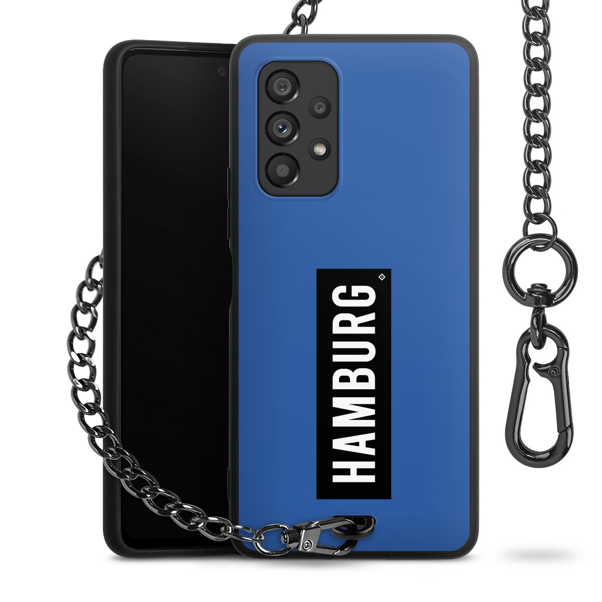Die Handyhülle verfügt über eine mittig am unteren Rand platzierte Öse, an der die Metallkette stabil befestigt ist. Bestelle die Hülle einfach für Dein Smartphone-Modell, dann passt sie wie angegossen und Du brauchst sie bloß einmal anzudrücken. Handy in die Tasche, Karabiner an den Hosenbund – schon kann die Party starten.