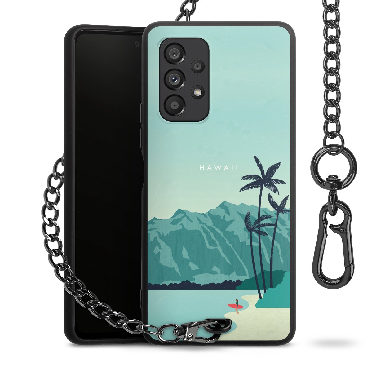 Die Handyhülle verfügt über eine mittig am unteren Rand platzierte Öse, an der die Metallkette stabil befestigt ist. Bestelle die Hülle einfach für Dein Smartphone-Modell, dann passt sie wie angegossen und Du brauchst sie bloß einmal anzudrücken. Handy in die Tasche, Karabiner an den Hosenbund – schon kann die Party starten.