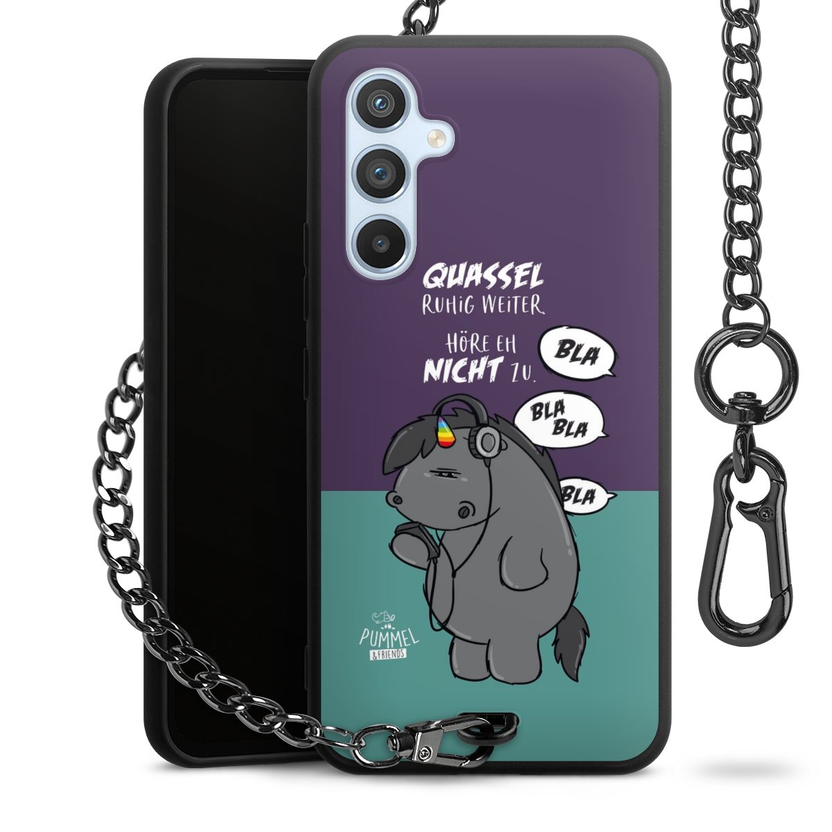Die mattschwarze Silikon-Handyhülle besteht aus robustem TPU (thermoplastisches Polyurethan). Sie ist flexibel und schützt Dein Smartphone vor Stößen und Kratzern. Die Kette sowie der Karabinerhaken sind aus Metall in Gunmetal-Optik gefertigt. Für dieses Produkt kommen ausschließlich TÜV-geprüfte Materialien zum Einsatz.