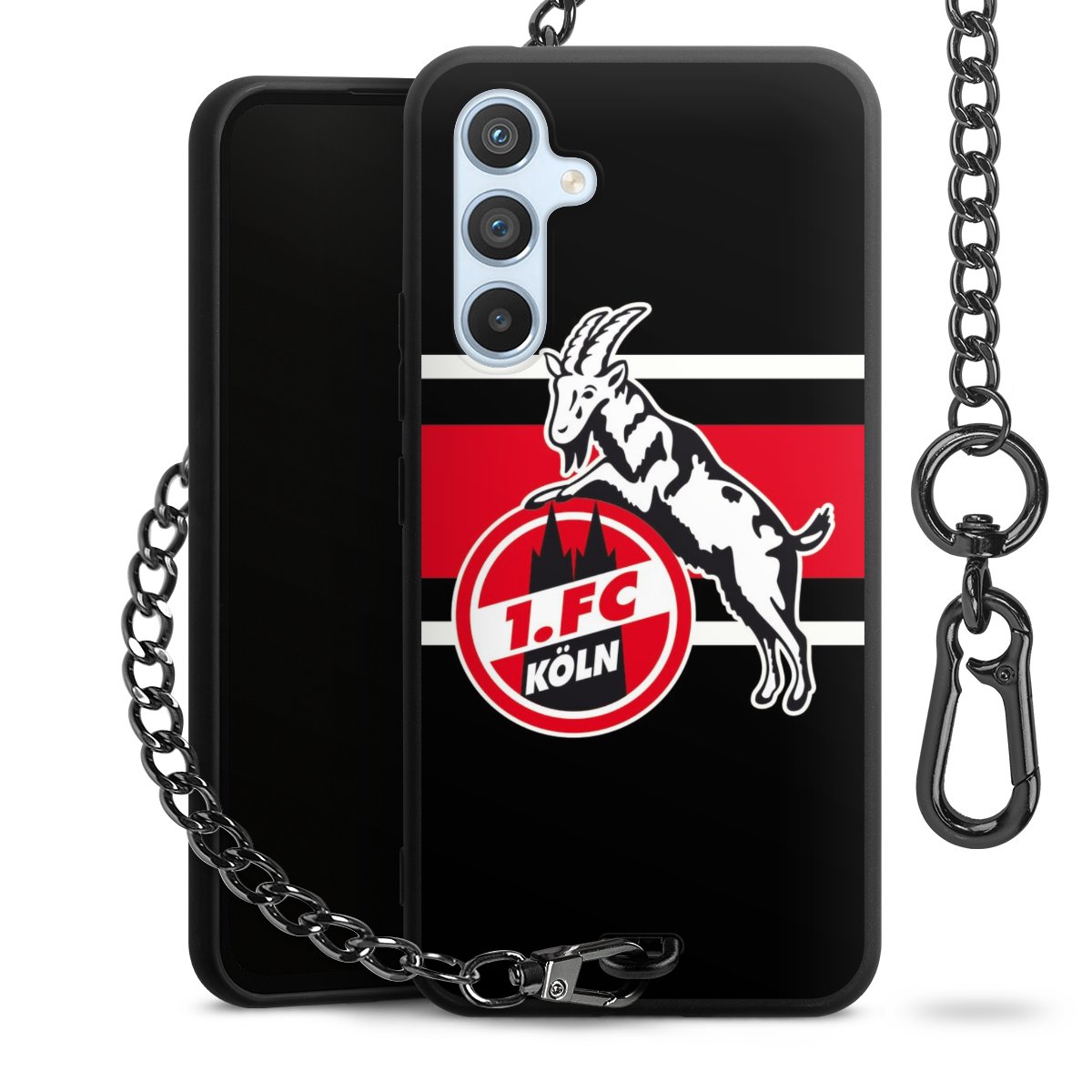 Die Handyhülle verfügt über eine mittig am unteren Rand platzierte Öse, an der die Metallkette stabil befestigt ist. Bestelle die Hülle einfach für Dein Smartphone-Modell, dann passt sie wie angegossen und Du brauchst sie bloß einmal anzudrücken. Handy in die Tasche, Karabiner an den Hosenbund – schon kann die Party starten.