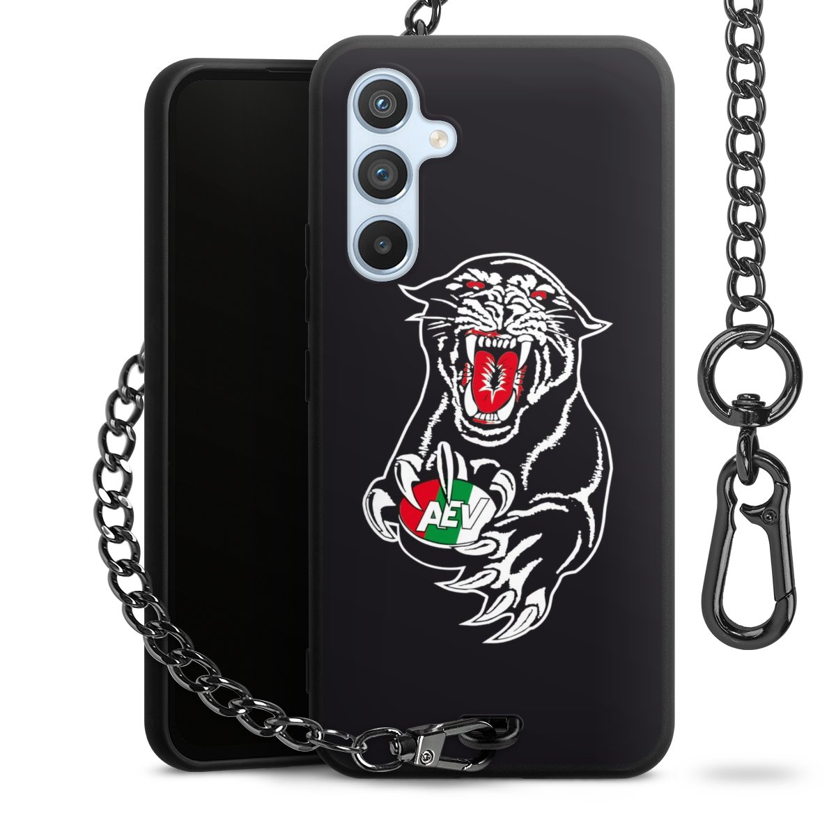 Die mattschwarze Silikon-Handyhülle besteht aus robustem TPU (thermoplastisches Polyurethan). Sie ist flexibel und schützt Dein Smartphone vor Stößen und Kratzern. Die Kette sowie der Karabinerhaken sind aus Metall in Gunmetal-Optik gefertigt. Für dieses Produkt kommen ausschließlich TÜV-geprüfte Materialien zum Einsatz.