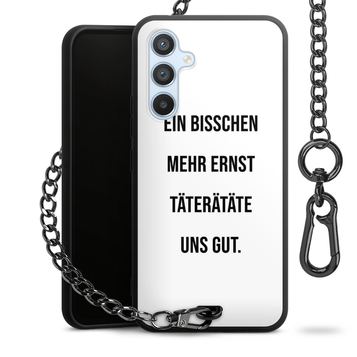 Die mattschwarze Silikon-Handyhülle besteht aus robustem TPU (thermoplastisches Polyurethan). Sie ist flexibel und schützt Dein Smartphone vor Stößen und Kratzern. Die Kette sowie der Karabinerhaken sind aus Metall in Gunmetal-Optik gefertigt. Für dieses Produkt kommen ausschließlich TÜV-geprüfte Materialien zum Einsatz.