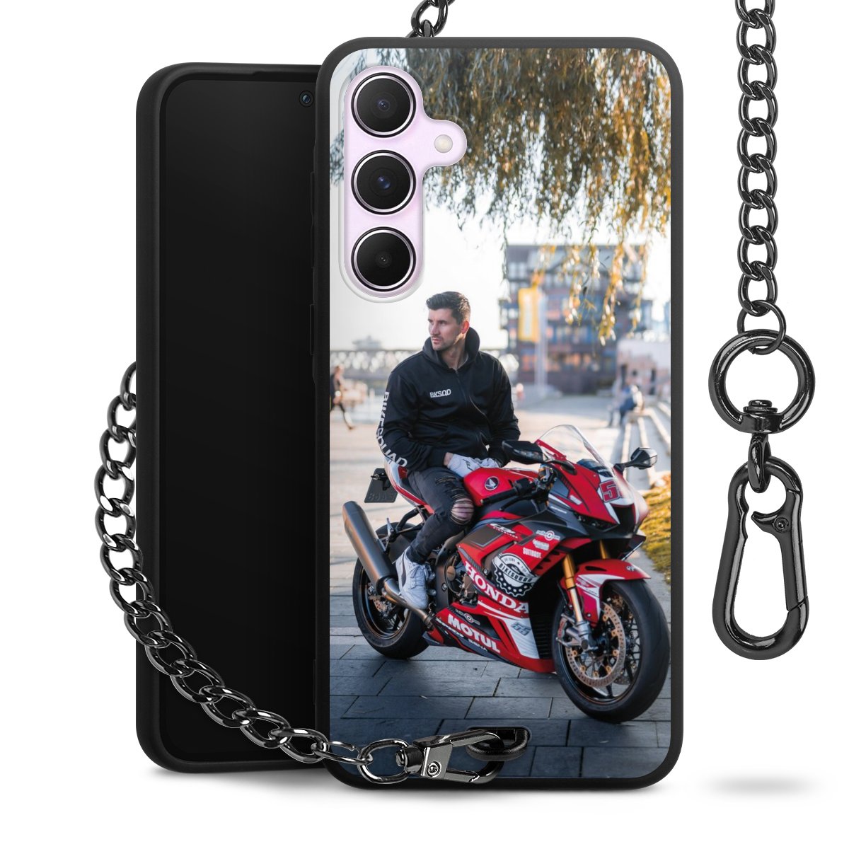 • Mattschwarze Handyhülle mit Metallkette