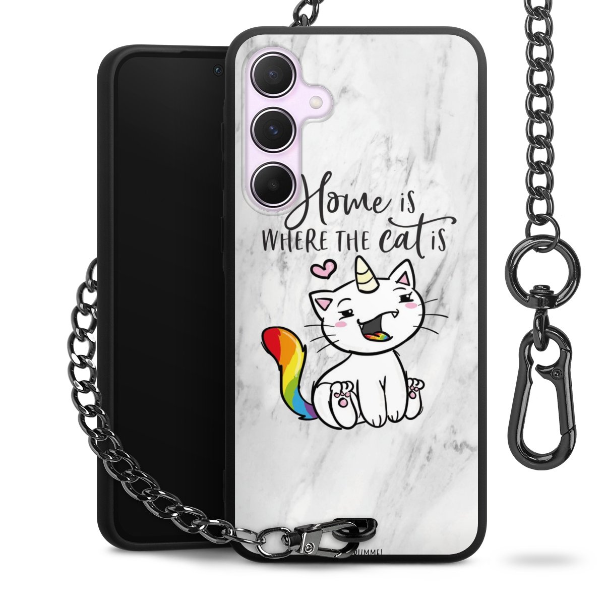 Die mattschwarze Silikon-Handyhülle besteht aus robustem TPU (thermoplastisches Polyurethan). Sie ist flexibel und schützt Dein Smartphone vor Stößen und Kratzern. Die Kette sowie der Karabinerhaken sind aus Metall in Gunmetal-Optik gefertigt. Für dieses Produkt kommen ausschließlich TÜV-geprüfte Materialien zum Einsatz.