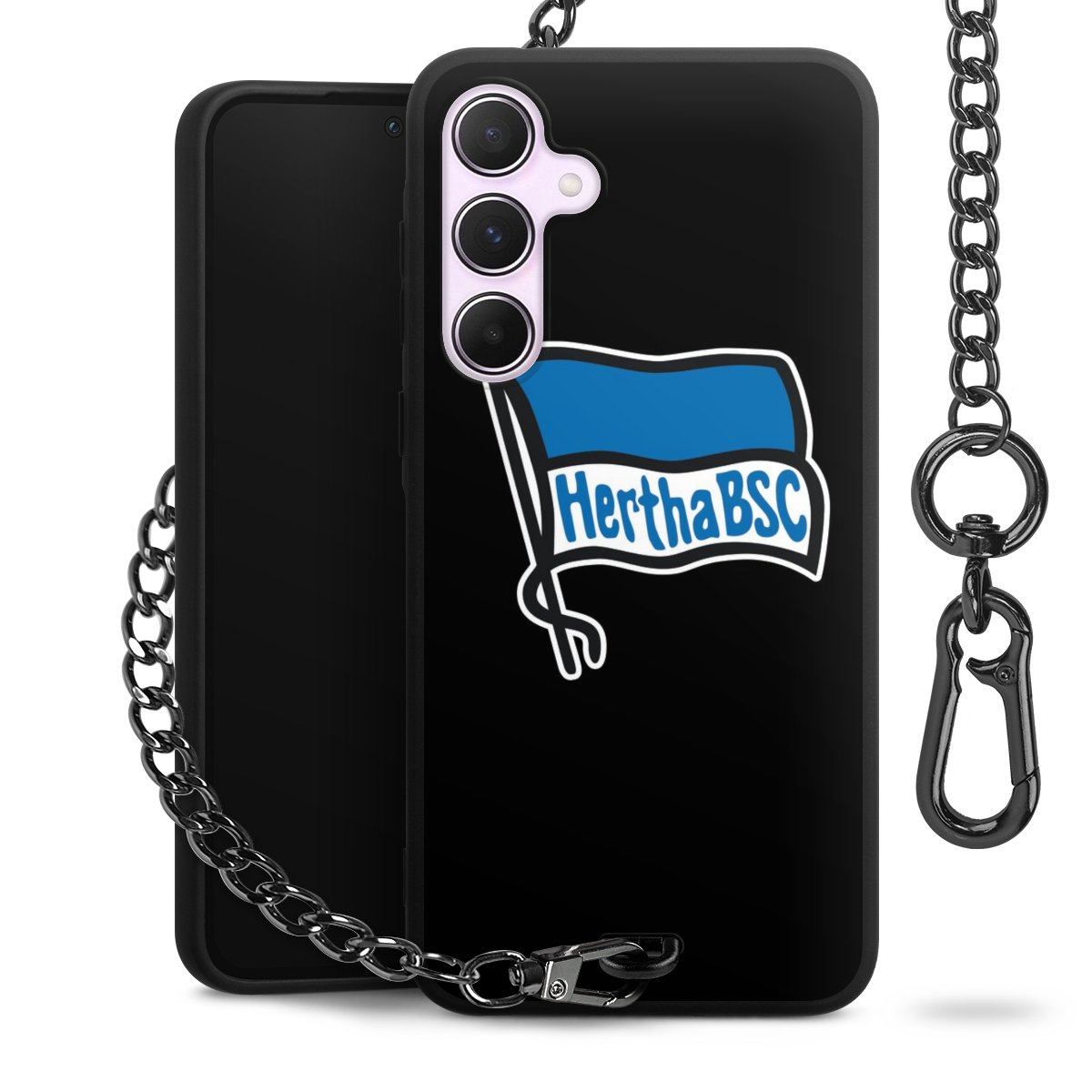 Die mattschwarze Silikon-Handyhülle besteht aus robustem TPU (thermoplastisches Polyurethan). Sie ist flexibel und schützt Dein Smartphone vor Stößen und Kratzern. Die Kette sowie der Karabinerhaken sind aus Metall in Gunmetal-Optik gefertigt. Für dieses Produkt kommen ausschließlich TÜV-geprüfte Materialien zum Einsatz.