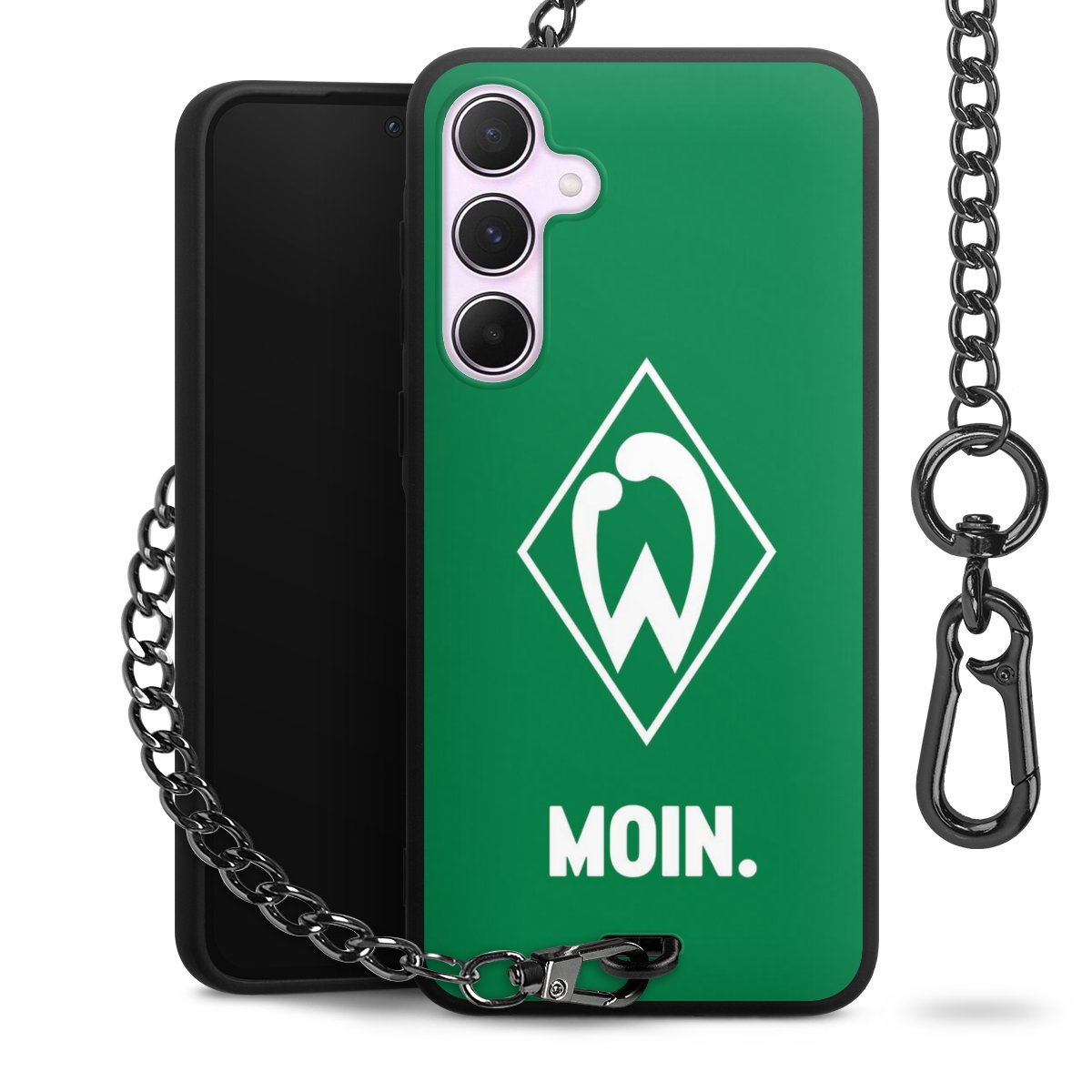 Die mattschwarze Silikon-Handyhülle besteht aus robustem TPU (thermoplastisches Polyurethan). Sie ist flexibel und schützt Dein Smartphone vor Stößen und Kratzern. Die Kette sowie der Karabinerhaken sind aus Metall in Gunmetal-Optik gefertigt. Für dieses Produkt kommen ausschließlich TÜV-geprüfte Materialien zum Einsatz.