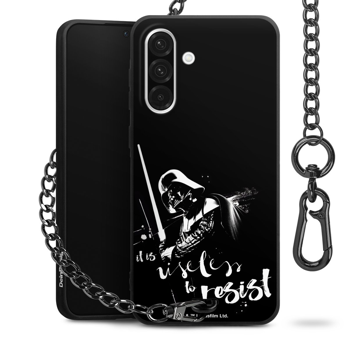 Die mattschwarze Silikon-Handyhülle besteht aus robustem TPU (thermoplastisches Polyurethan). Sie ist flexibel und schützt Dein Smartphone vor Stößen und Kratzern. Die Kette sowie der Karabinerhaken sind aus Metall in Gunmetal-Optik gefertigt. Für dieses Produkt kommen ausschließlich TÜV-geprüfte Materialien zum Einsatz.