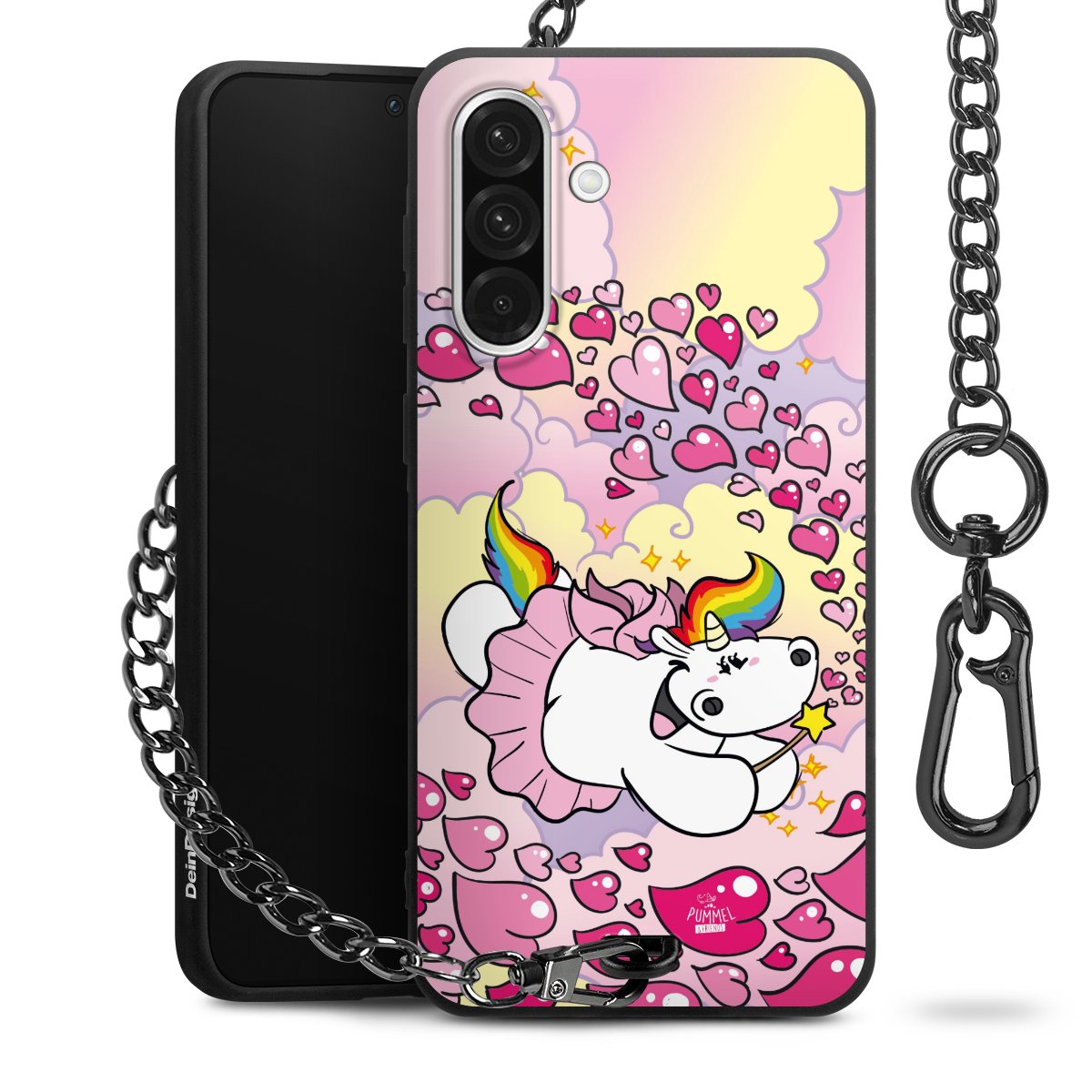 Die mattschwarze Silikon-Handyhülle besteht aus robustem TPU (thermoplastisches Polyurethan). Sie ist flexibel und schützt Dein Smartphone vor Stößen und Kratzern. Die Kette sowie der Karabinerhaken sind aus Metall in Gunmetal-Optik gefertigt. Für dieses Produkt kommen ausschließlich TÜV-geprüfte Materialien zum Einsatz.