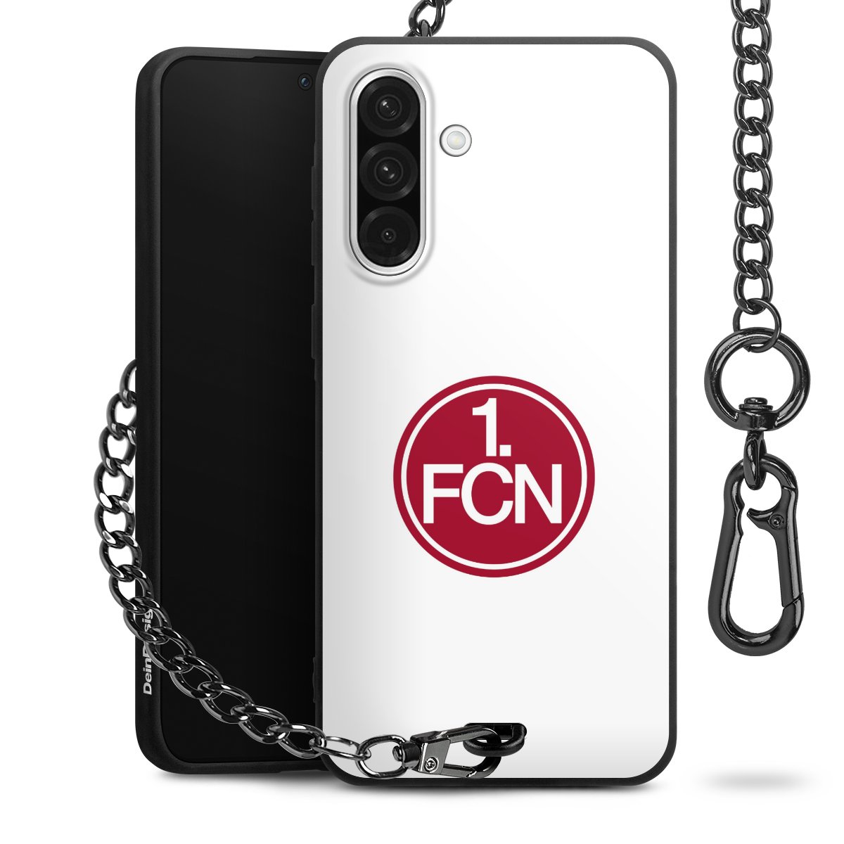 Die Handyhülle verfügt über eine mittig am unteren Rand platzierte Öse, an der die Metallkette stabil befestigt ist. Bestelle die Hülle einfach für Dein Smartphone-Modell, dann passt sie wie angegossen und Du brauchst sie bloß einmal anzudrücken. Handy in die Tasche, Karabiner an den Hosenbund – schon kann die Party starten.
