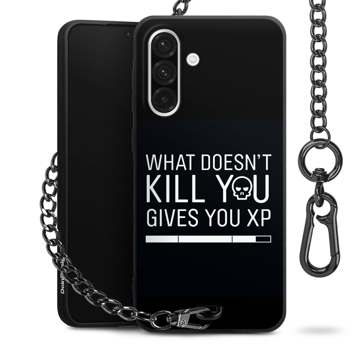 Die mattschwarze Silikon-Handyhülle besteht aus robustem TPU (thermoplastisches Polyurethan). Sie ist flexibel und schützt Dein Smartphone vor Stößen und Kratzern. Die Kette sowie der Karabinerhaken sind aus Metall in Gunmetal-Optik gefertigt. Für dieses Produkt kommen ausschließlich TÜV-geprüfte Materialien zum Einsatz.