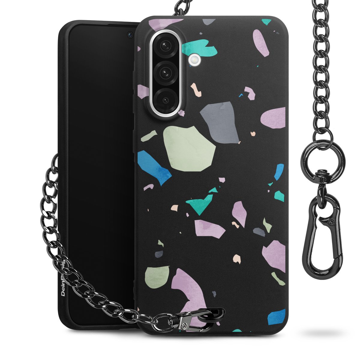Die mattschwarze Silikon-Handyhülle besteht aus robustem TPU (thermoplastisches Polyurethan). Sie ist flexibel und schützt Dein Smartphone vor Stößen und Kratzern. Die Kette sowie der Karabinerhaken sind aus Metall in Gunmetal-Optik gefertigt. Für dieses Produkt kommen ausschließlich TÜV-geprüfte Materialien zum Einsatz.